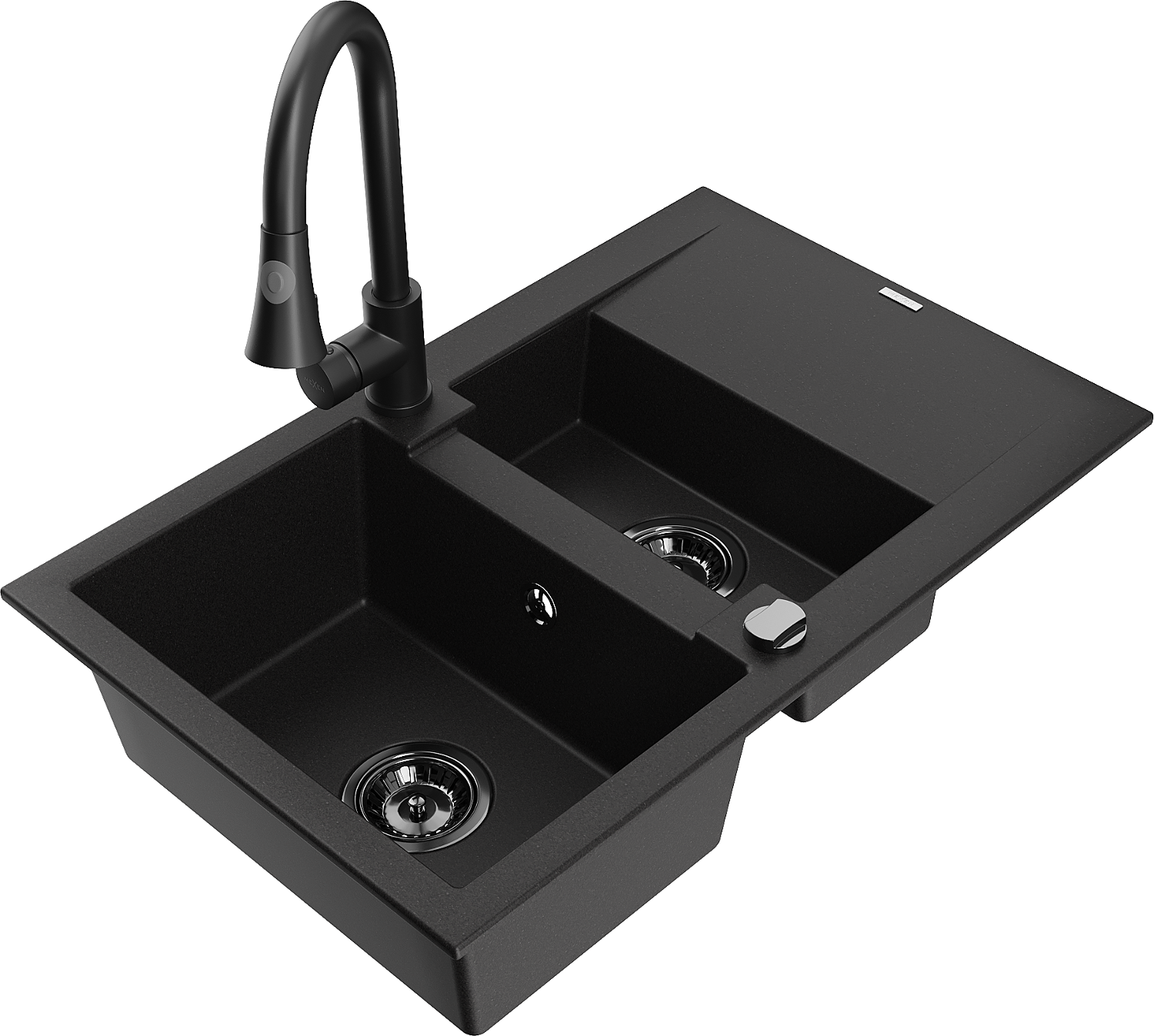 Mexen Gaspar évier en granit 1,5 bac avec égouttoir et robinet de cuisine Elia, noir - 6507-77-670101-70-B