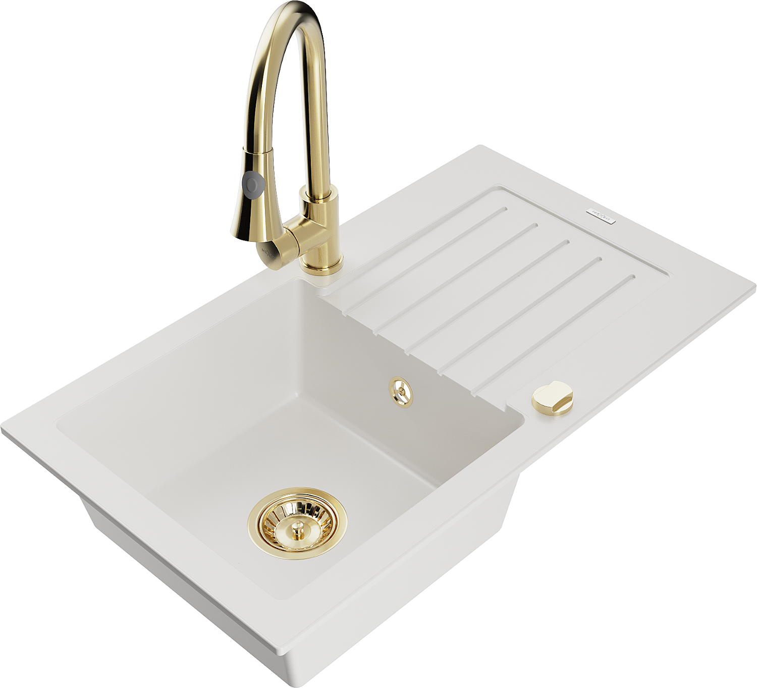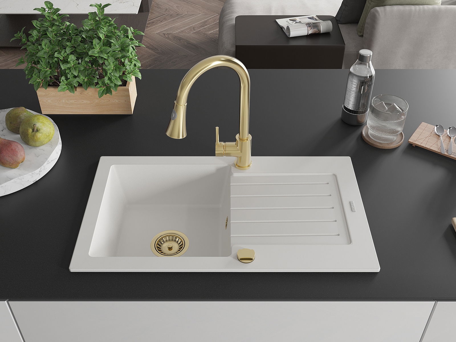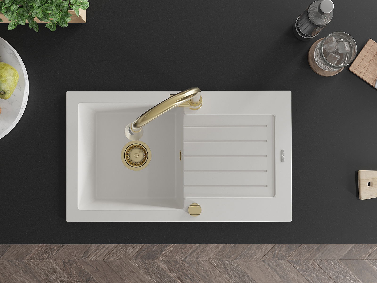 Mexen Pablo évier de cuisine en granit 1 bac avec égouttoir et robinet de cuisine Elia, blanc - 6510-20-670101-50