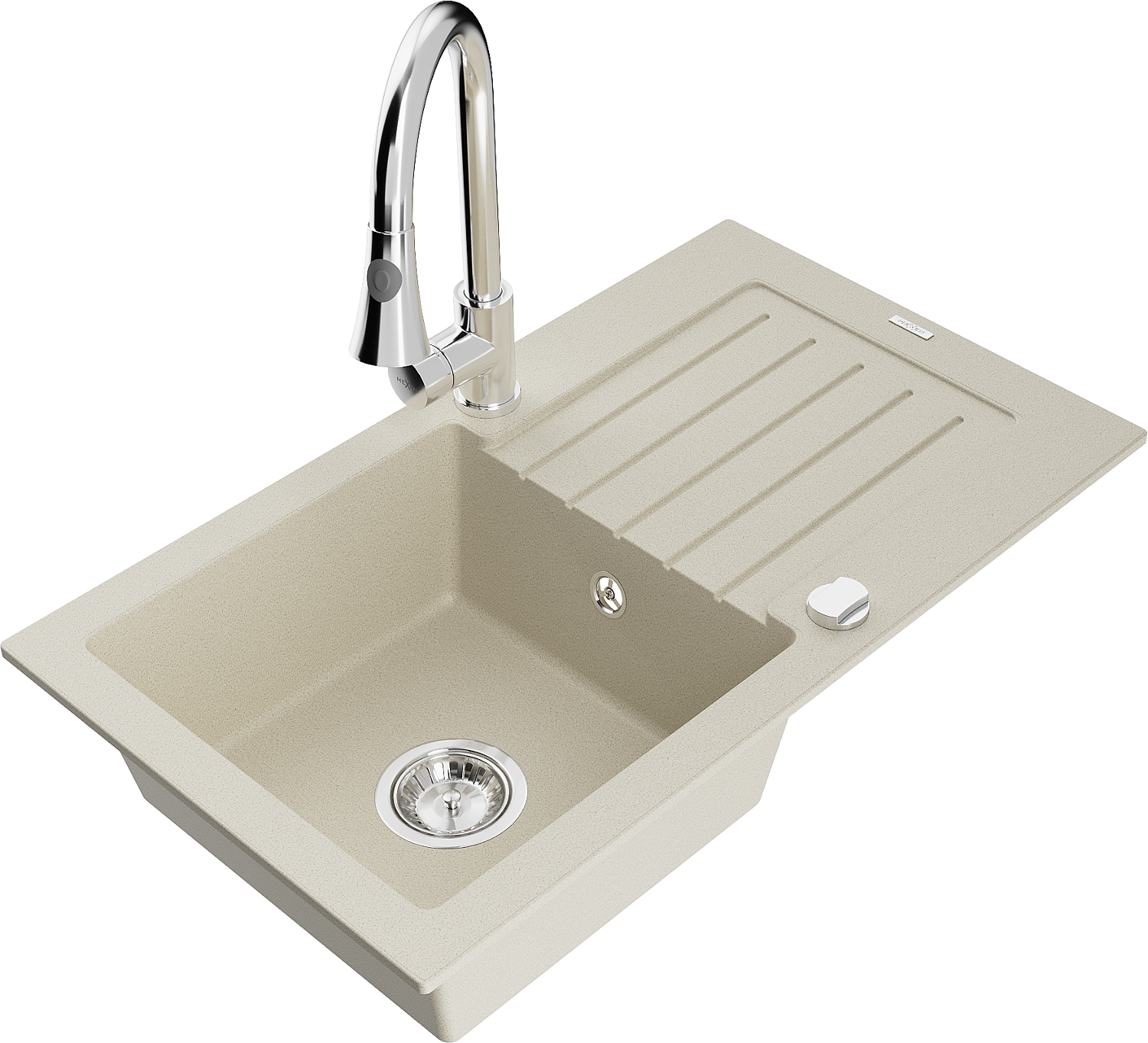 Mexen Pablo évier en granit 1 bac avec égouttoir et robinet de cuisine Elia, beige - 6510-69-670101-00