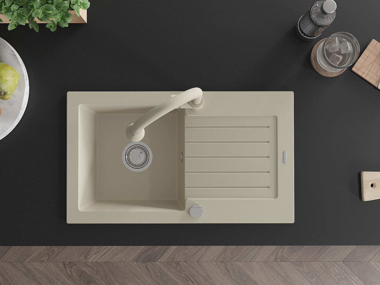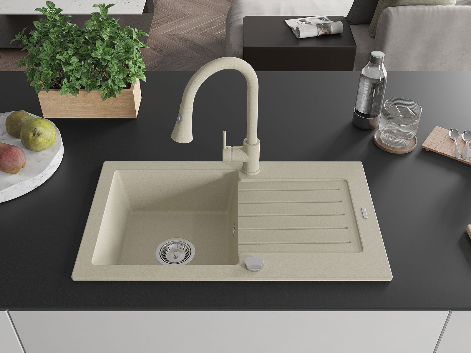 Mexen Pablo évier en granit à 1 bac avec égouttoir et robinet de cuisine Elia, beige - 6510-69-670101-69
