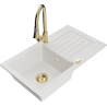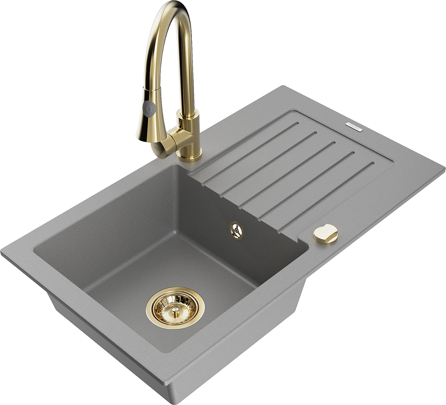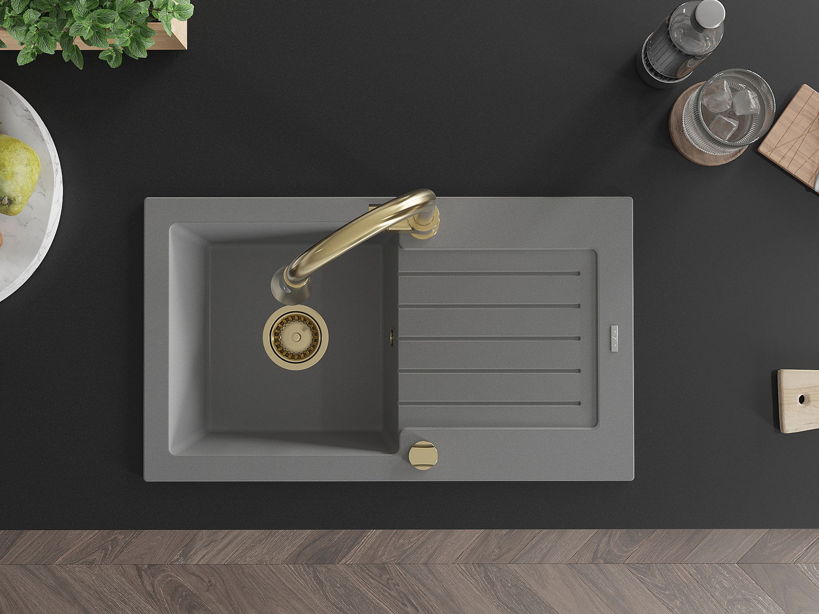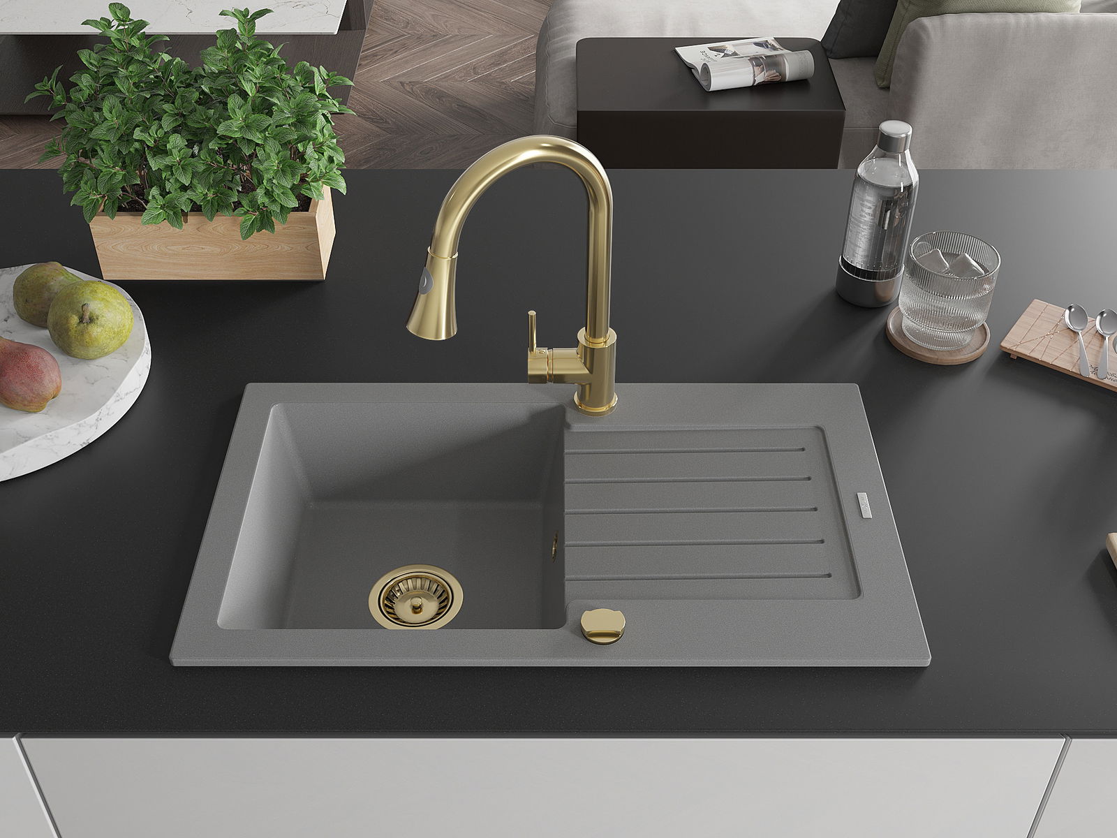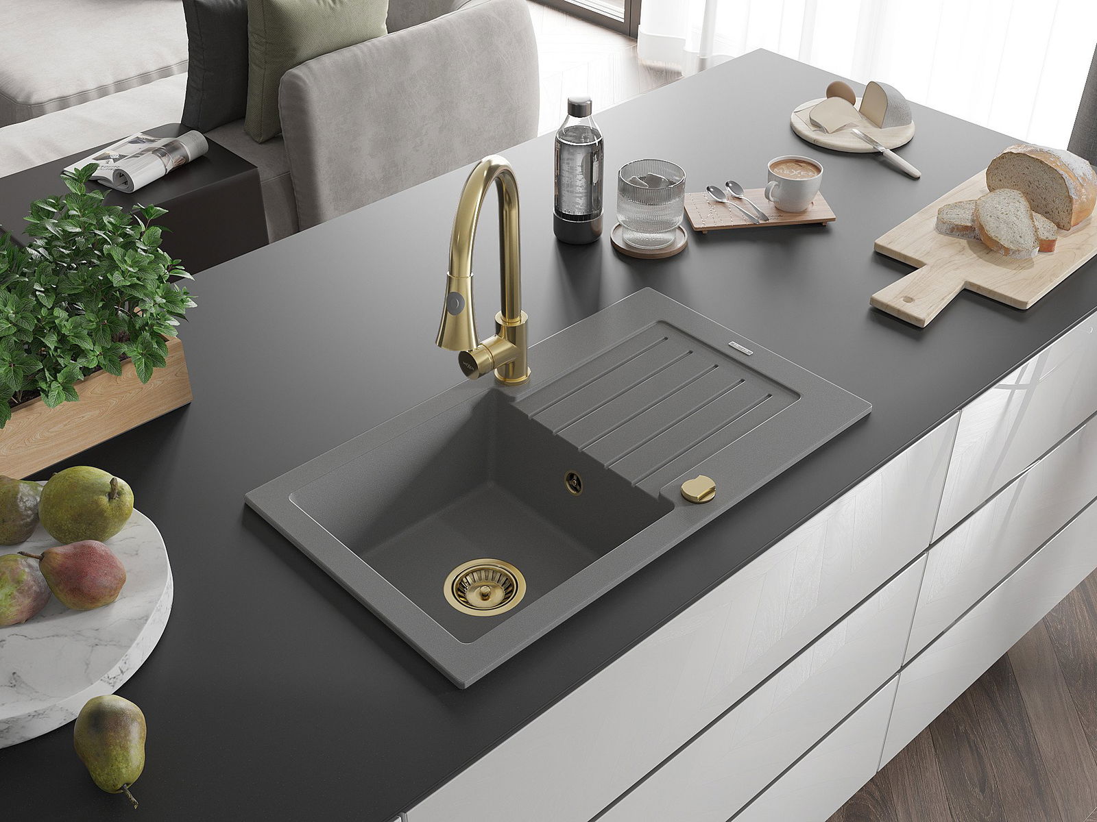 Mexen Pablo évier en granit 1 bac avec égouttoir et robinet de cuisine Elia, gris - 6510-71-670101-50