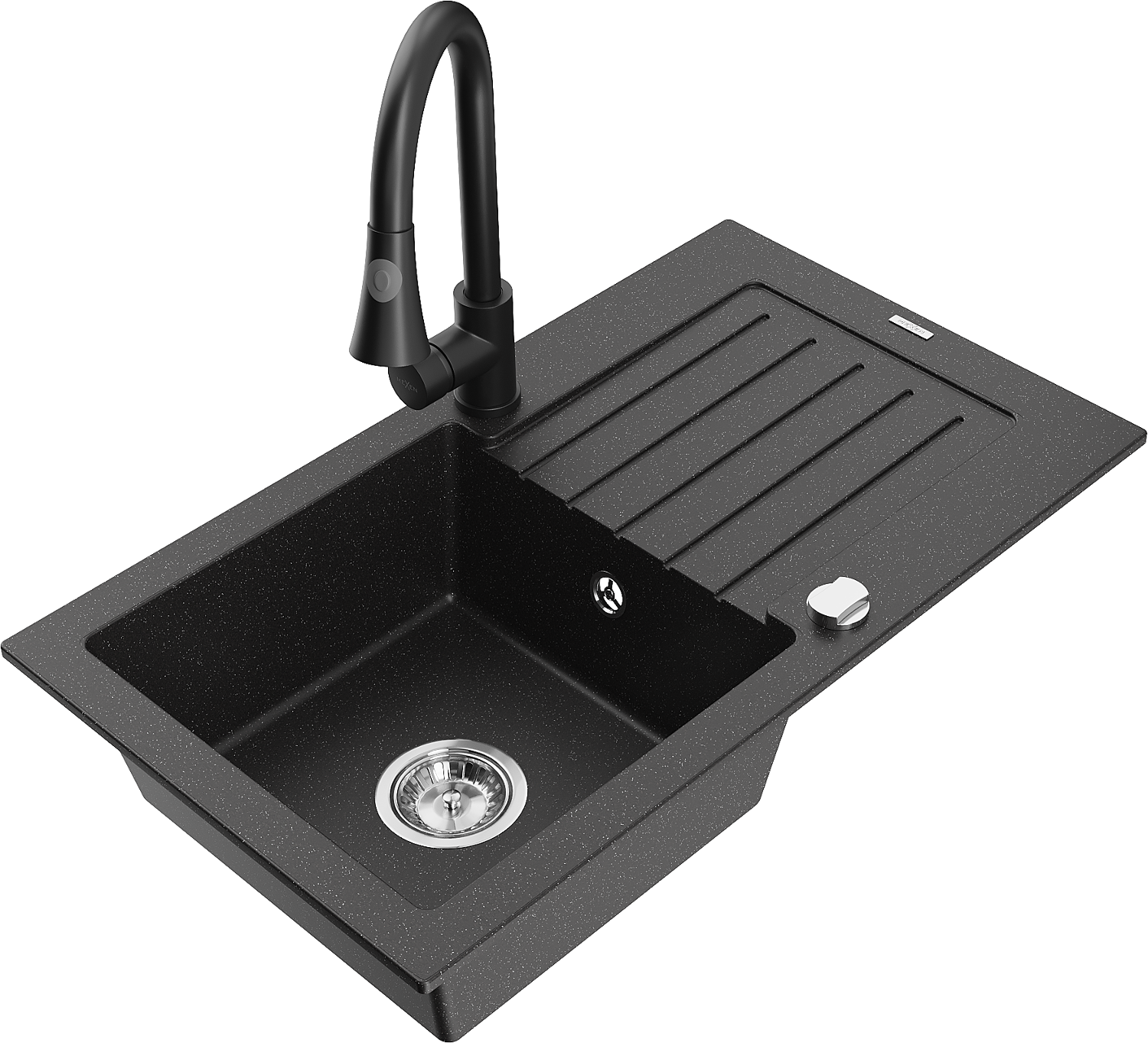 Mexen Pablo évier en granit 1 bac avec égouttoir et robinet de cuisine Elia, noir/argent métallique - 6510-73-670101-70