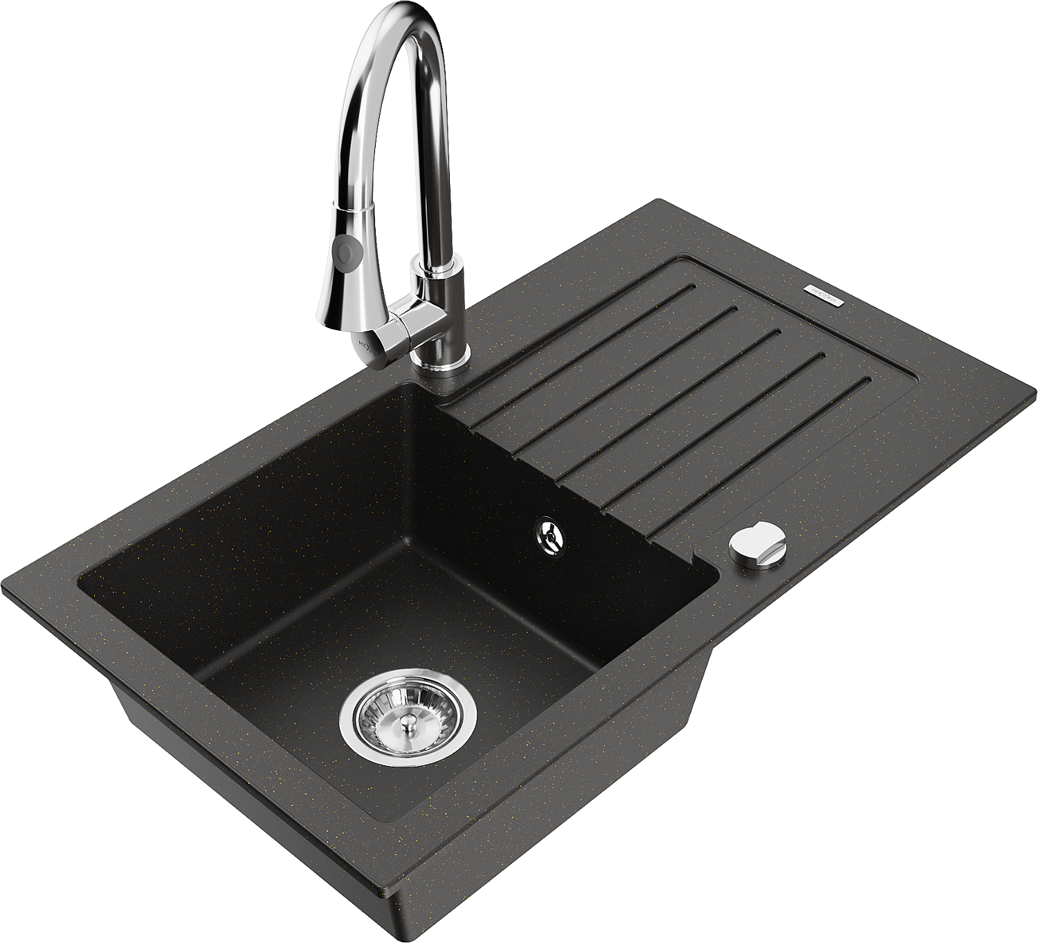 Mexen Pablo évier de cuisine en granit 1 bac avec égouttoir et robinet de cuisine Elia, noir/or métallisé - 6510-75-670101-00