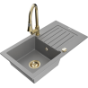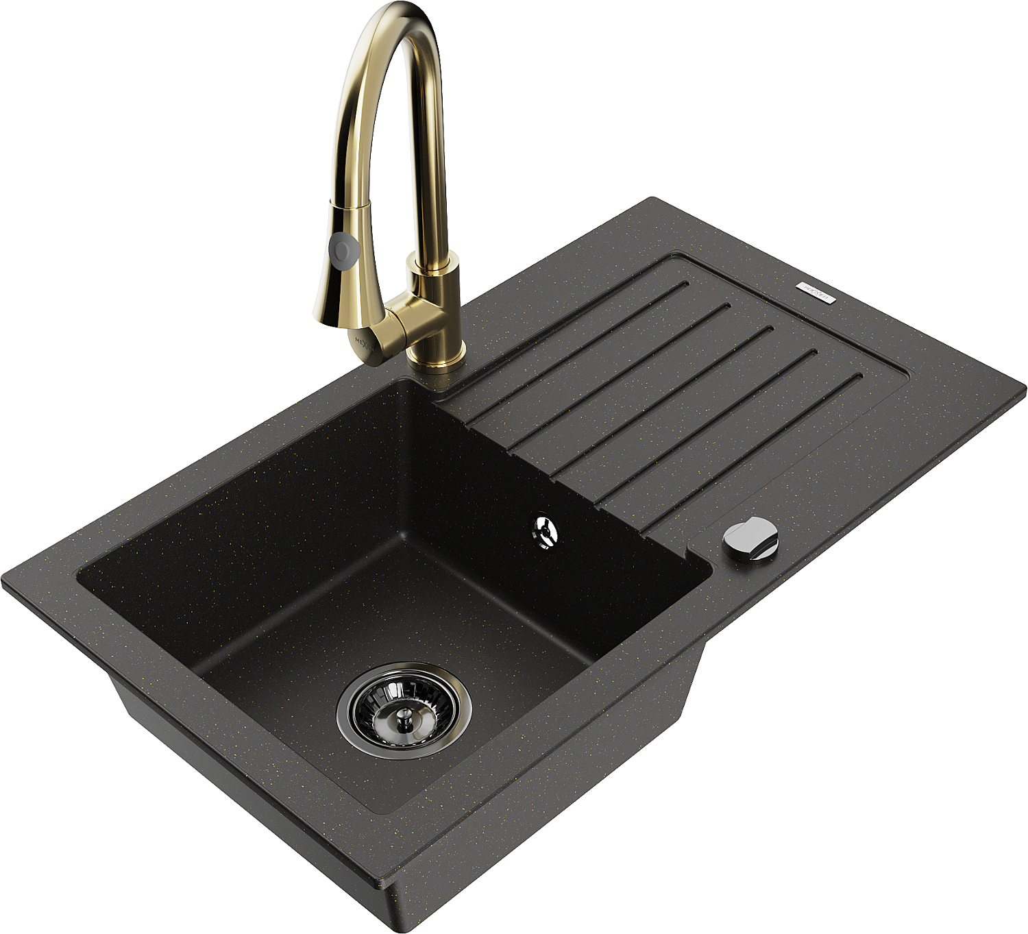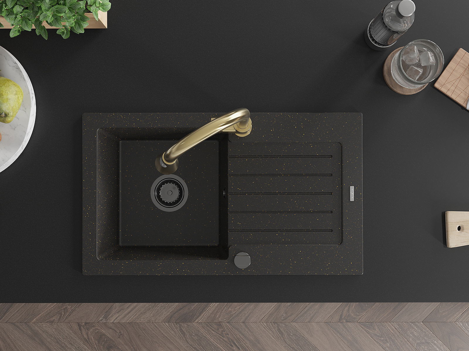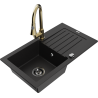 Mexen Pablo évier en granit 1 bac avec égouttoir et robinet de cuisine Elia, noir/or métallisé - 6510-75-670101-50-B