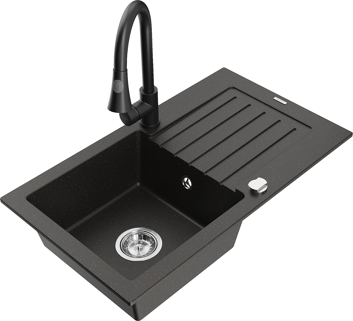 Mexen Pablo évier en granit 1 bac avec égouttoir et robinet de cuisine Elia, noir/or métallisé - 6510-75-670101-70