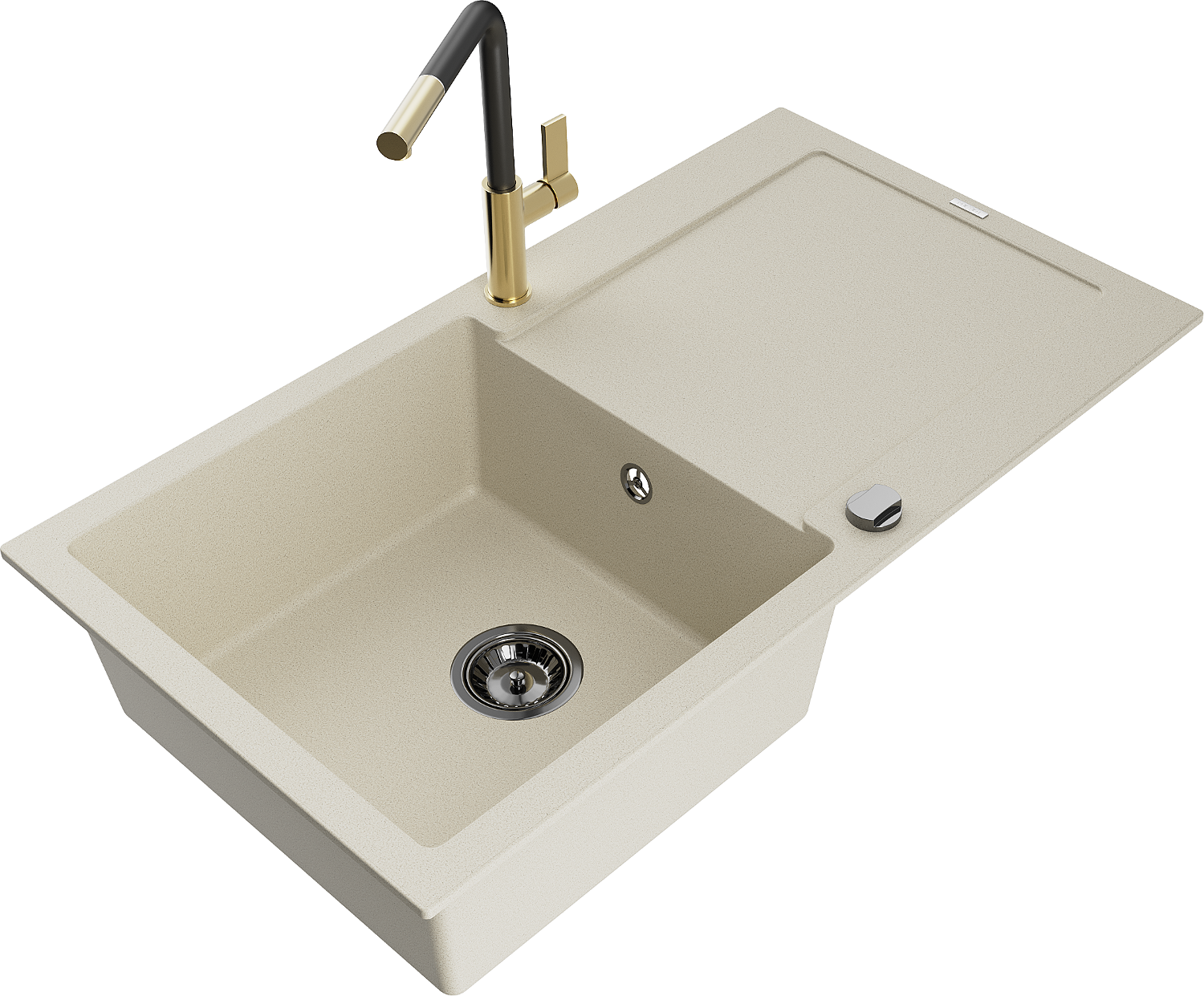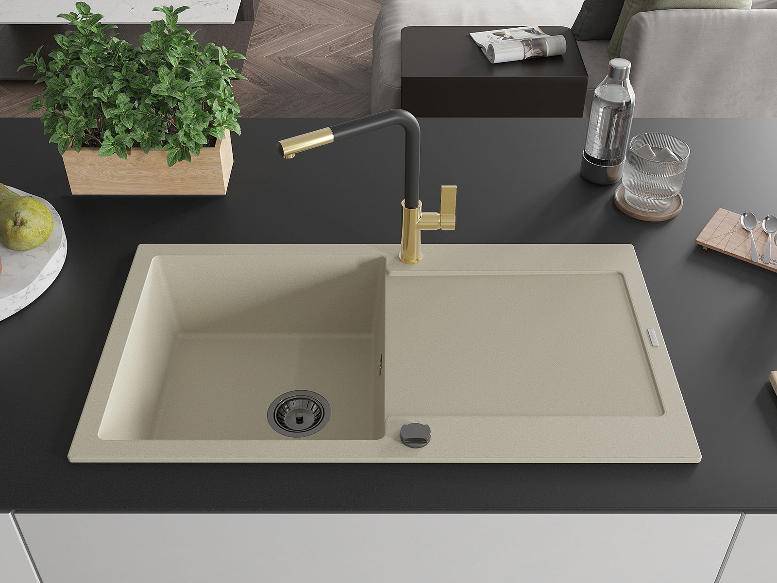 Mexen Leo évier en granit 1 bac avec égouttoir et robinet de cuisine Flora, beige - 6501-69-670401-57-B