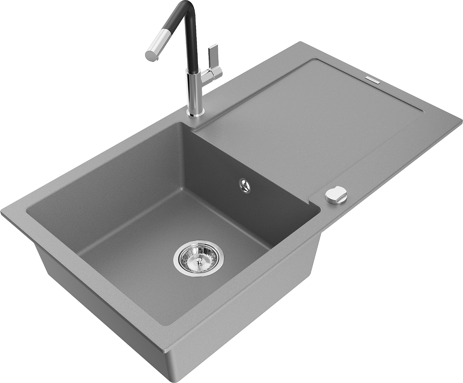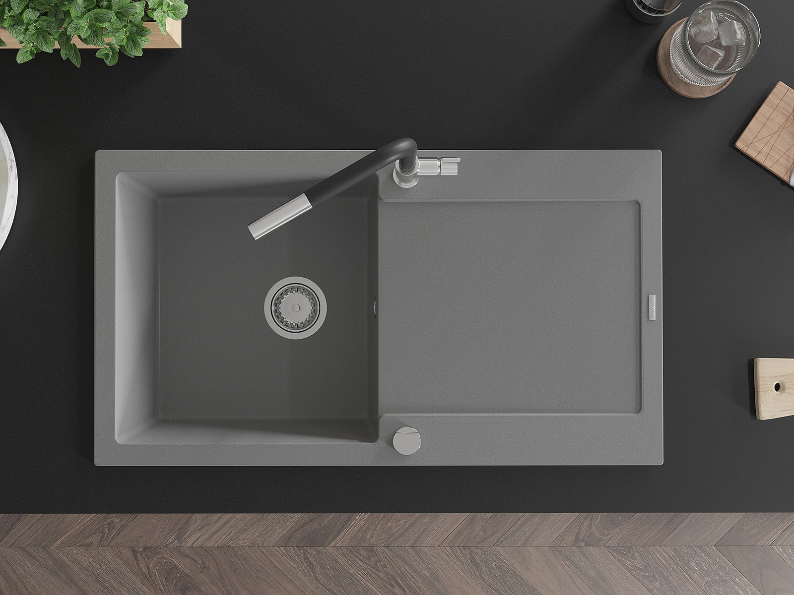 Mexen Leo évier en granit à 1 bac avec égouttoir et robinet de cuisine Flora, gris - 6501-71-670401-07