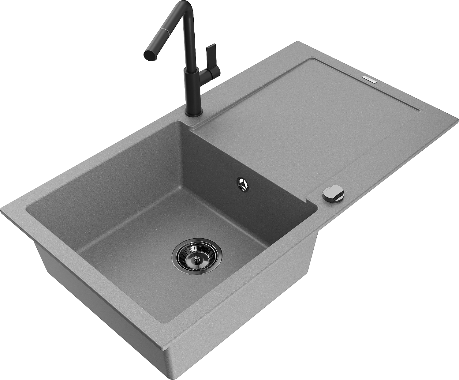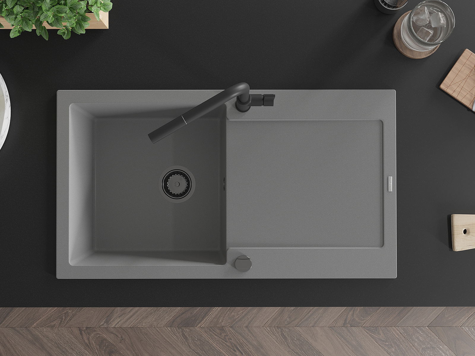 Mexen Leo évier en granit 1 bac avec égouttoir et robinet de cuisine Flora, gris - 6501-71-670401-70-B