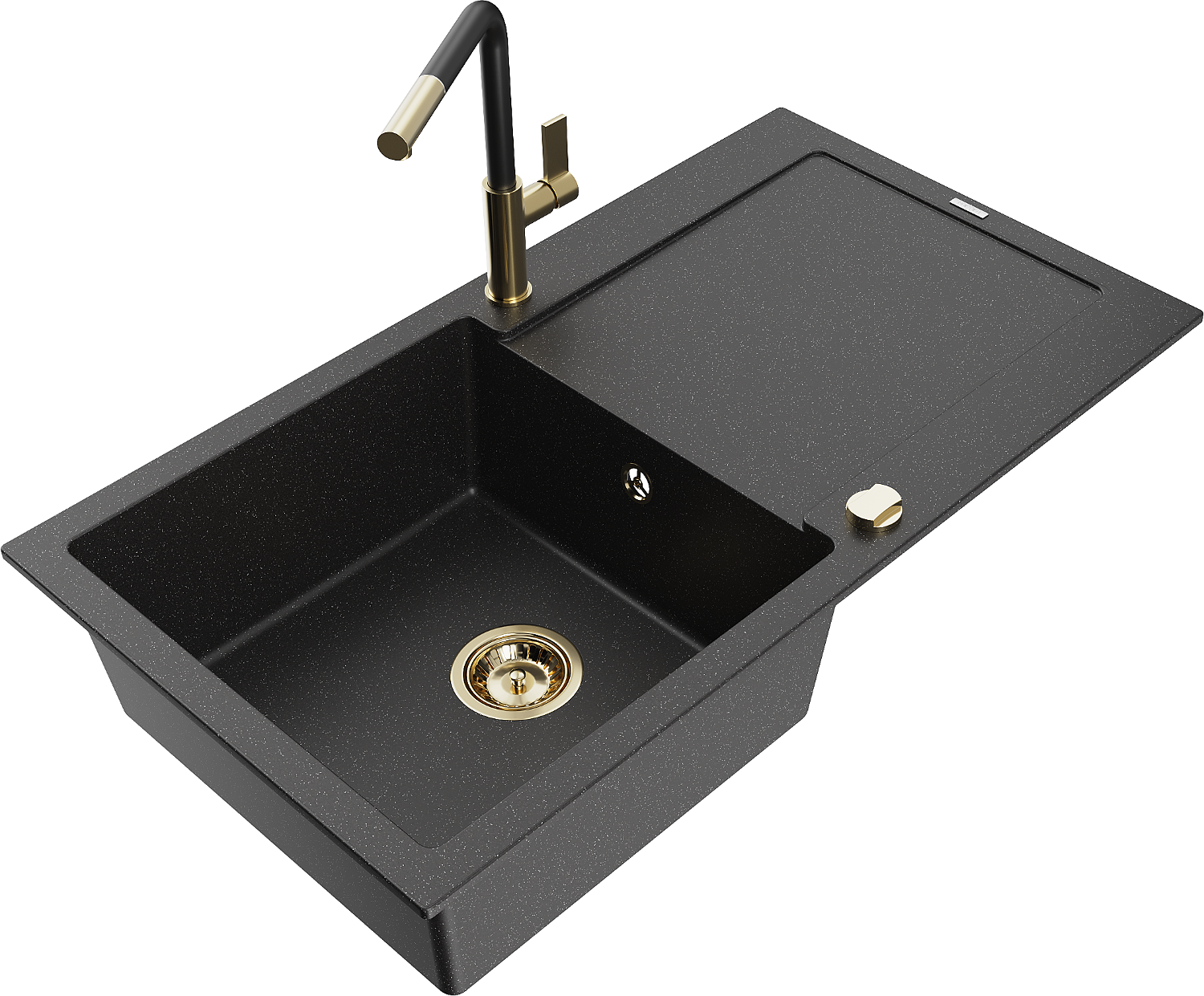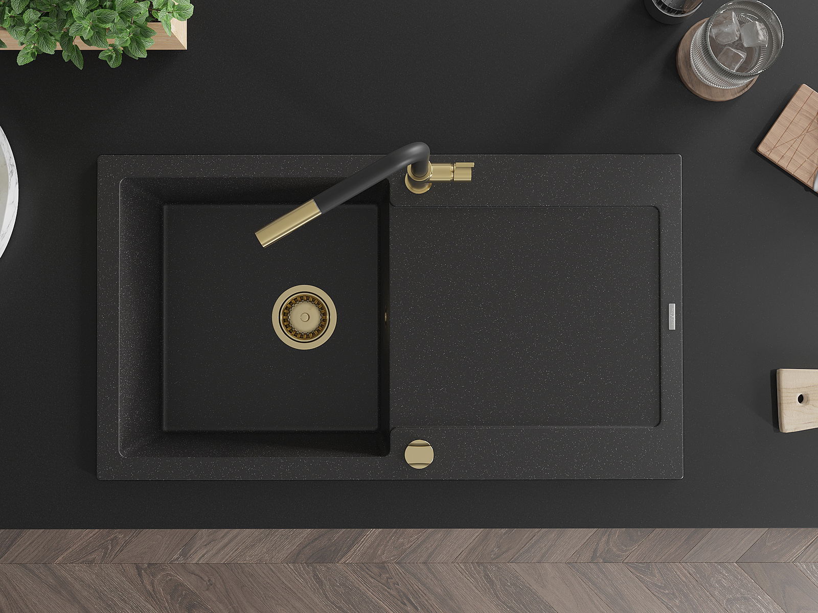 Mexen Leo évier en granit 1 bac avec égouttoir et robinet de cuisine Flora, noir/argent métallique - 6501-73-670401-57-G