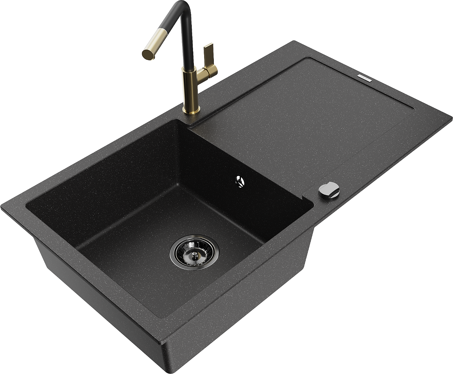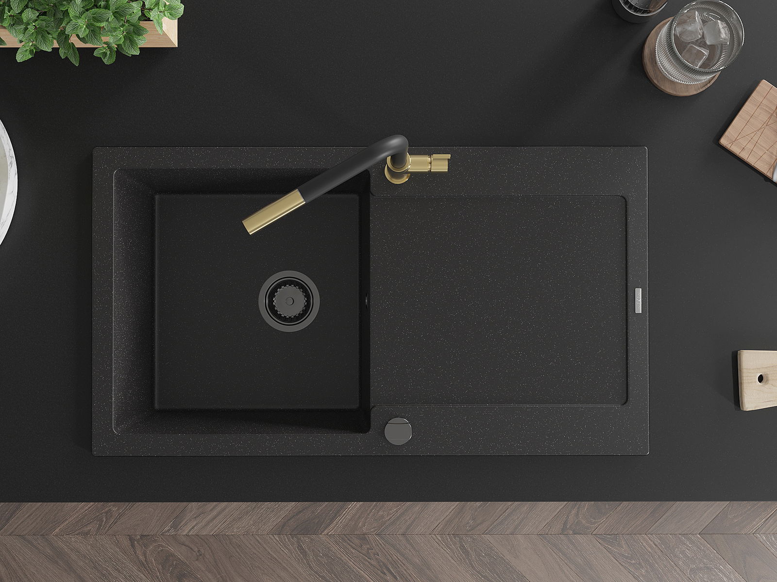 Mexen Leo évier de cuisine en granit 1 bac avec égouttoir et mitigeur Flora, noir/argent métallisé - 6501-73-670401-57-B