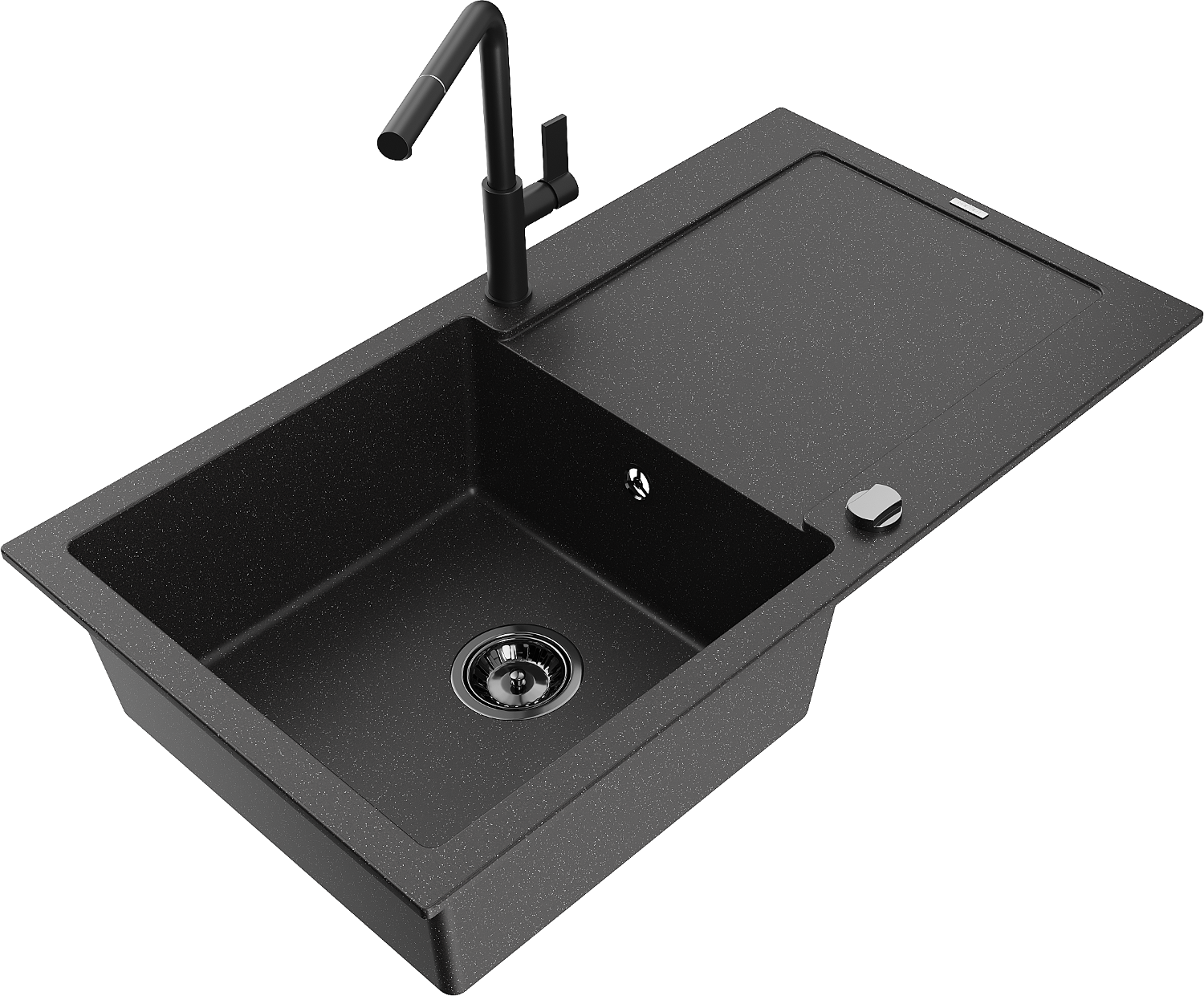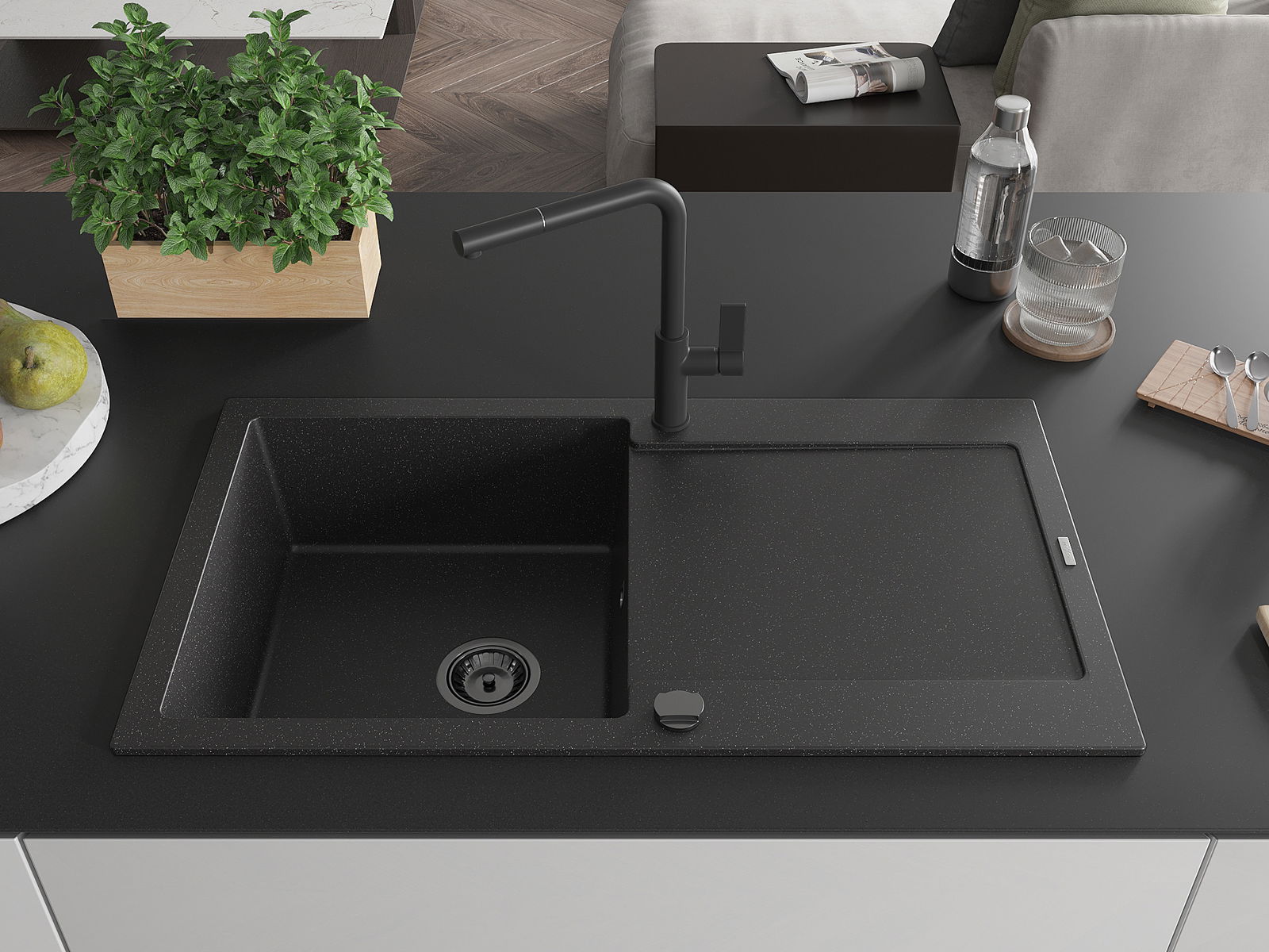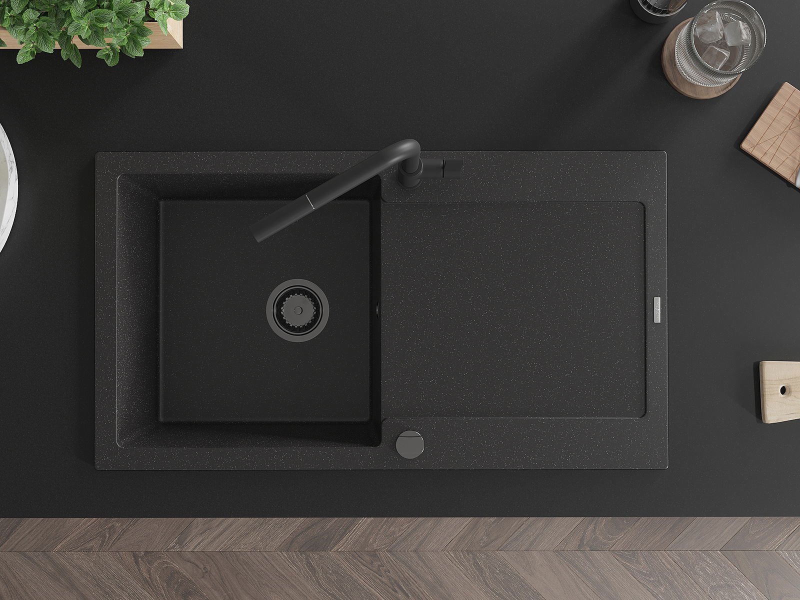 Mexen Leo évier en granit 1 bac avec égouttoir et robinet de cuisine Flora, noir/métallique argenté - 6501-73-670401-70-B