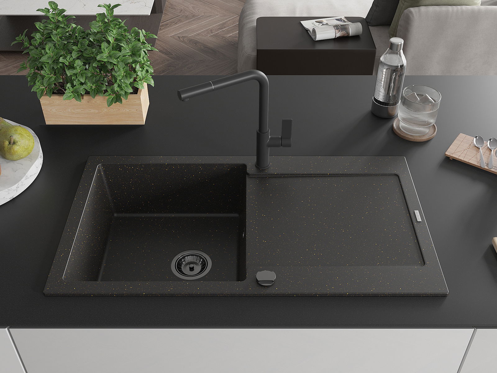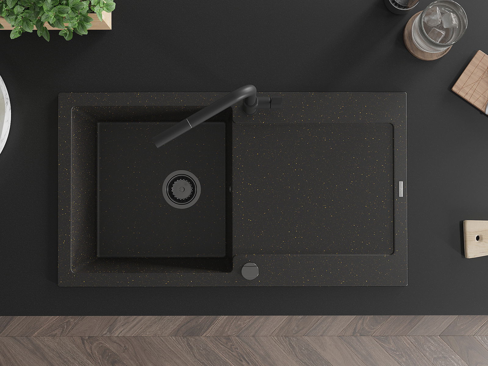 Mexen Leo évier de cuisine en granit 1 bac avec égouttoir et robinet de cuisine Flora, noir/or métallique - 6501-75-670401-70-B