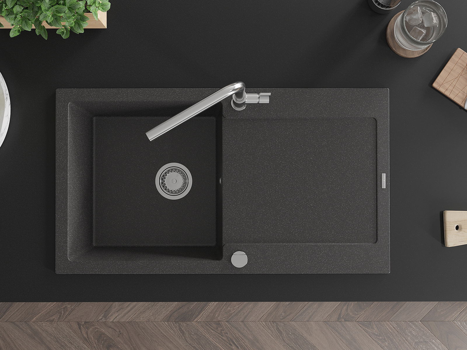 Mexen Leo évier en granit à 1 bac avec égouttoir et mitigeur de cuisine Flora, noir moucheté - 6501-76-670401-00