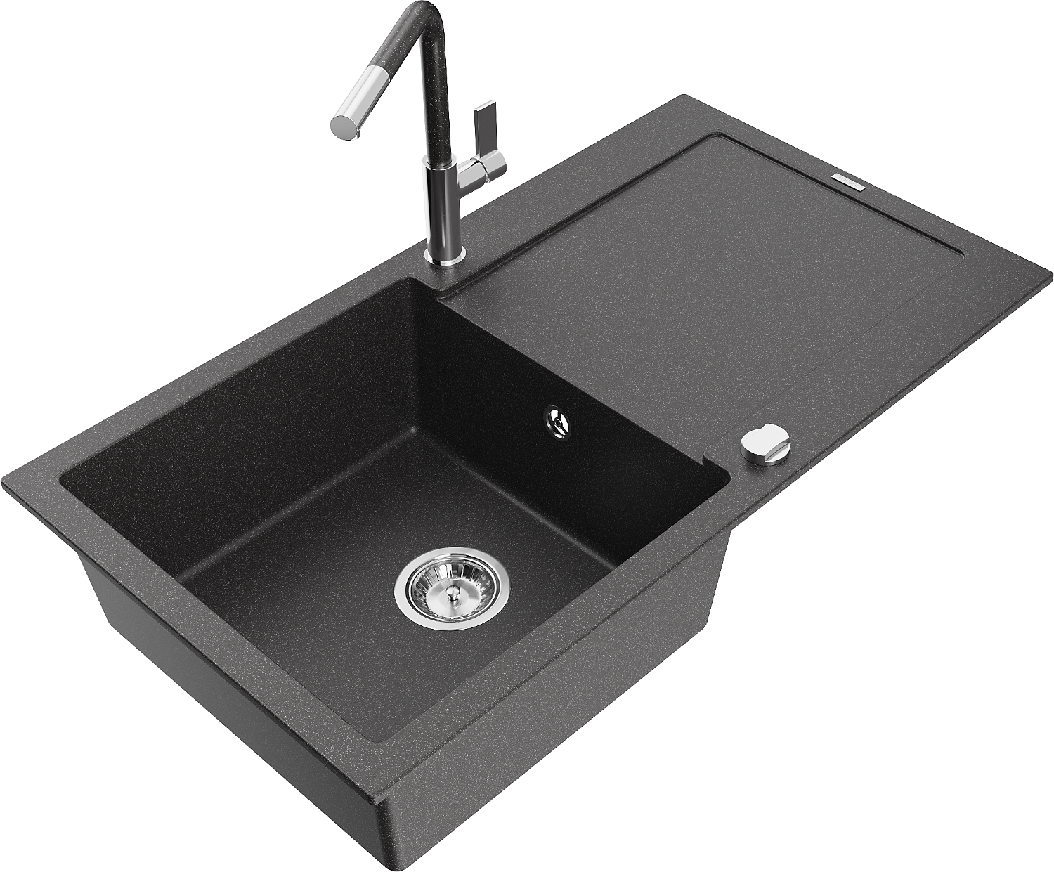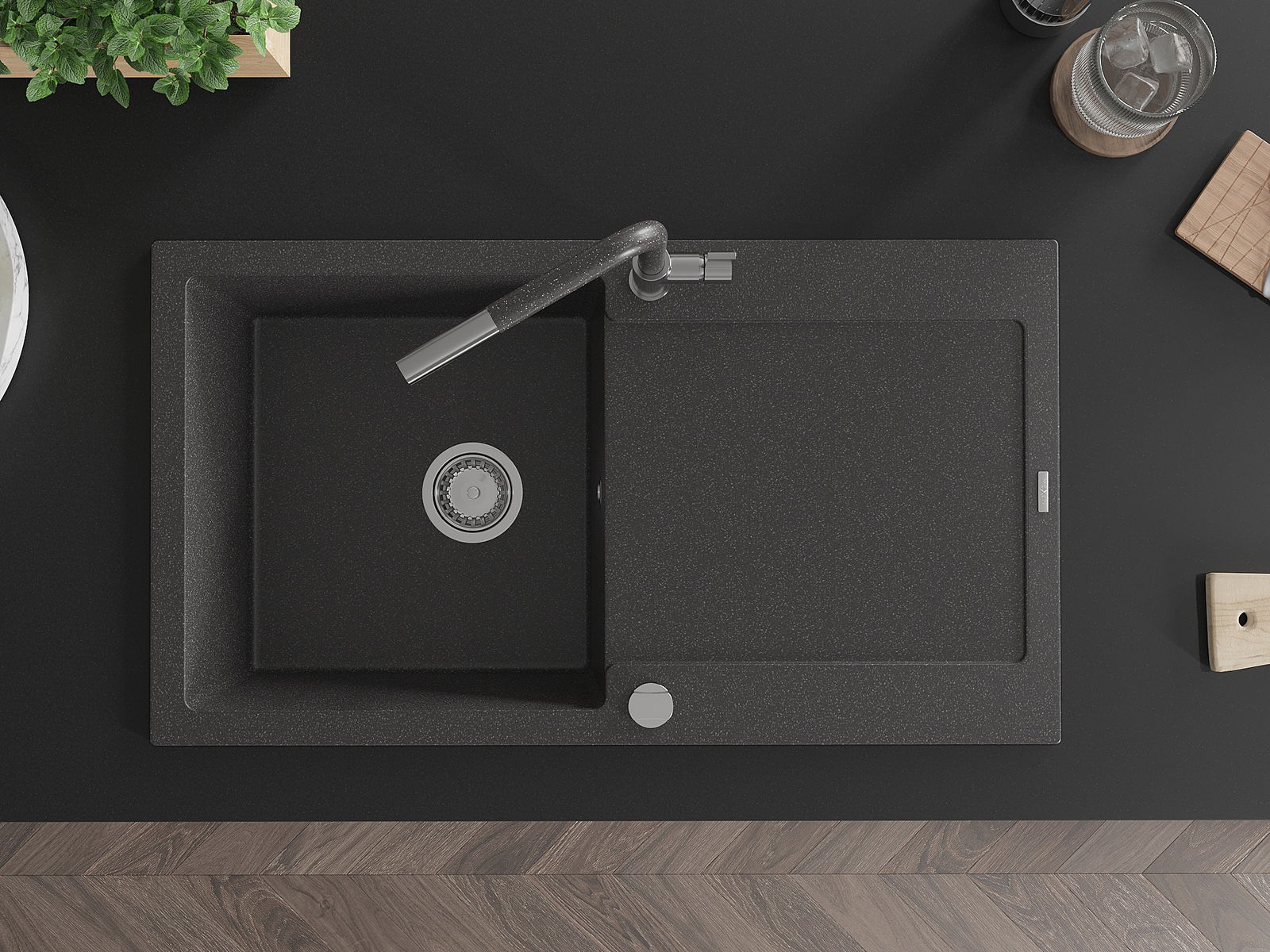 Mexen Leo évier en granit 1 bac avec égouttoir et robinet de cuisine Flora, noir moucheté - 6501-76-670401-08