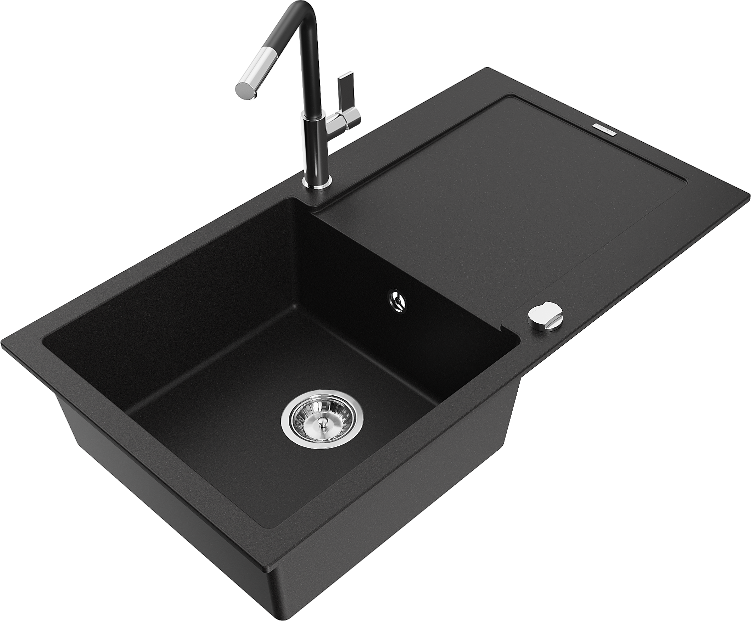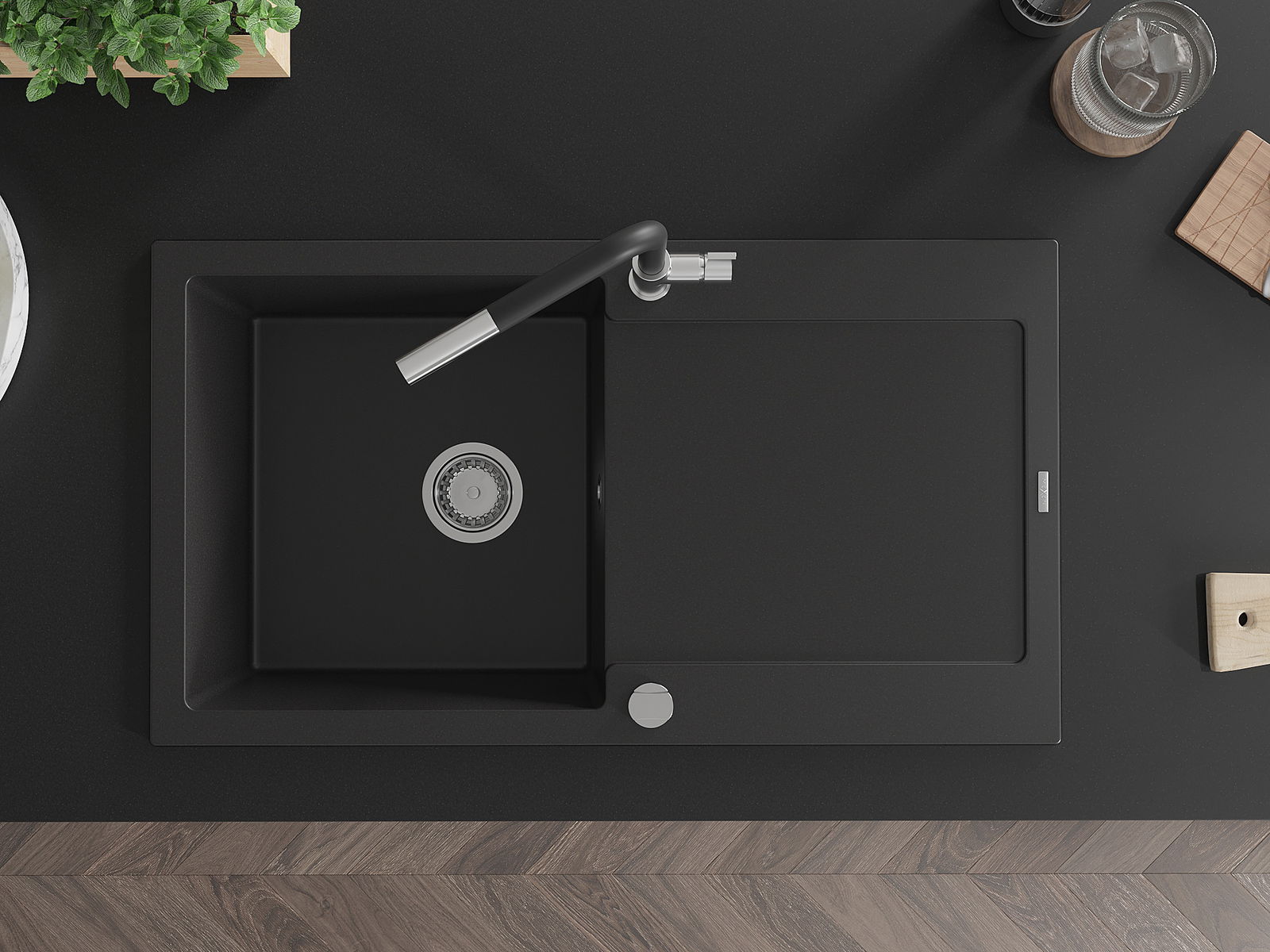 Mexen Leo évier en granit 1 bac avec égouttoir et mitigeur de cuisine Flora, noir - 6501-77-670401-07