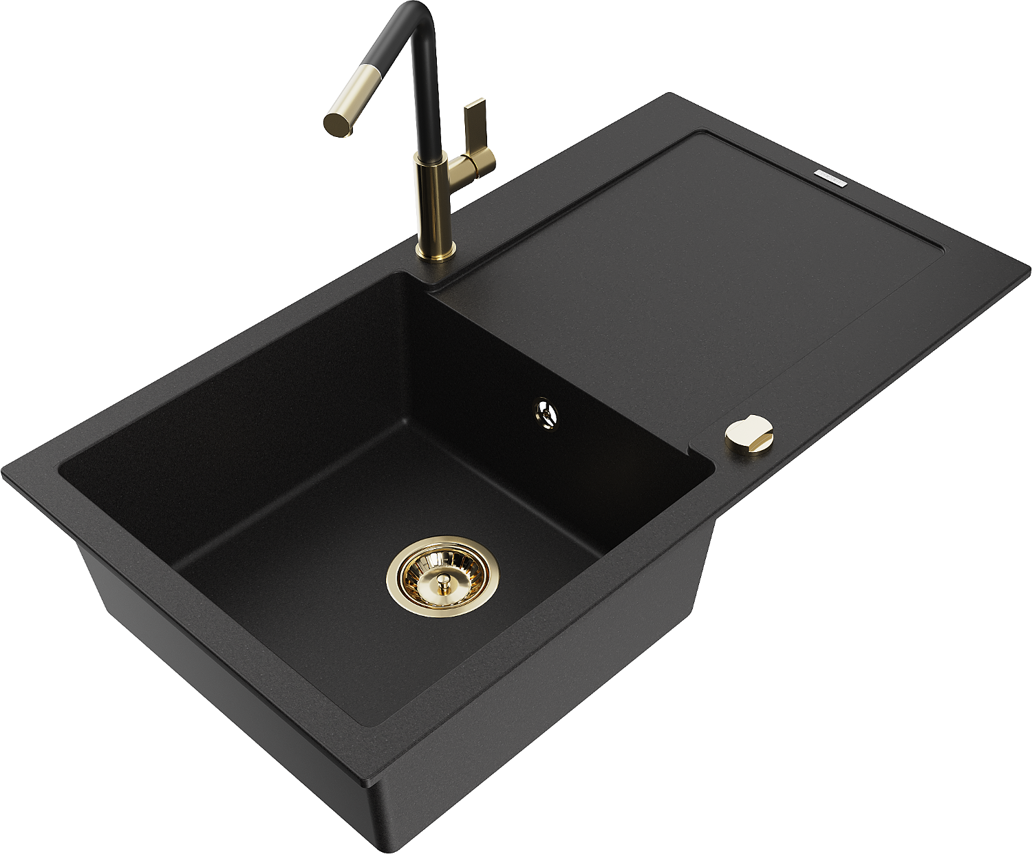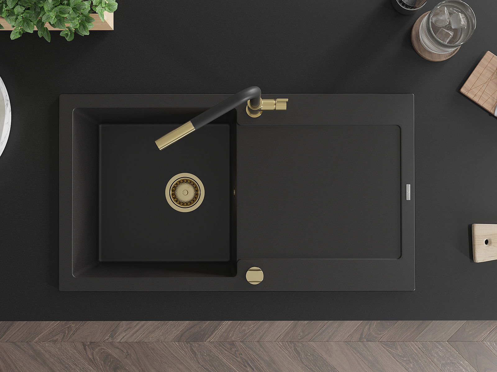 Mexen Leo évier en granit 1-bac avec égouttoir et robinet de cuisine Flora, noir - 6501-77-670401-57-G