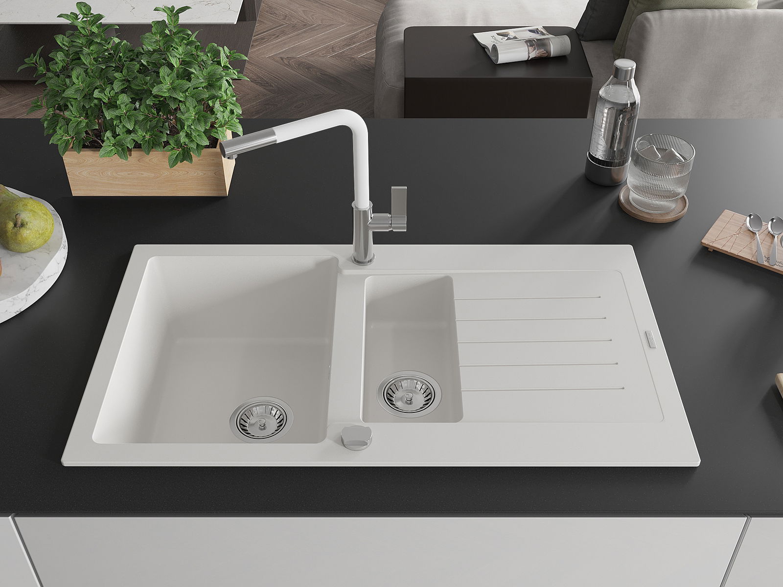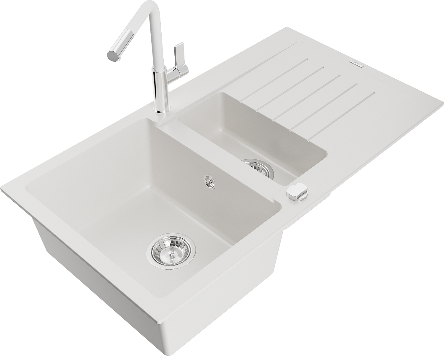 Mexen Matias évier en granit 1,5 bac avec égouttoir et mitigeur de cuisine Flora, blanc - 6502-20-670401-02