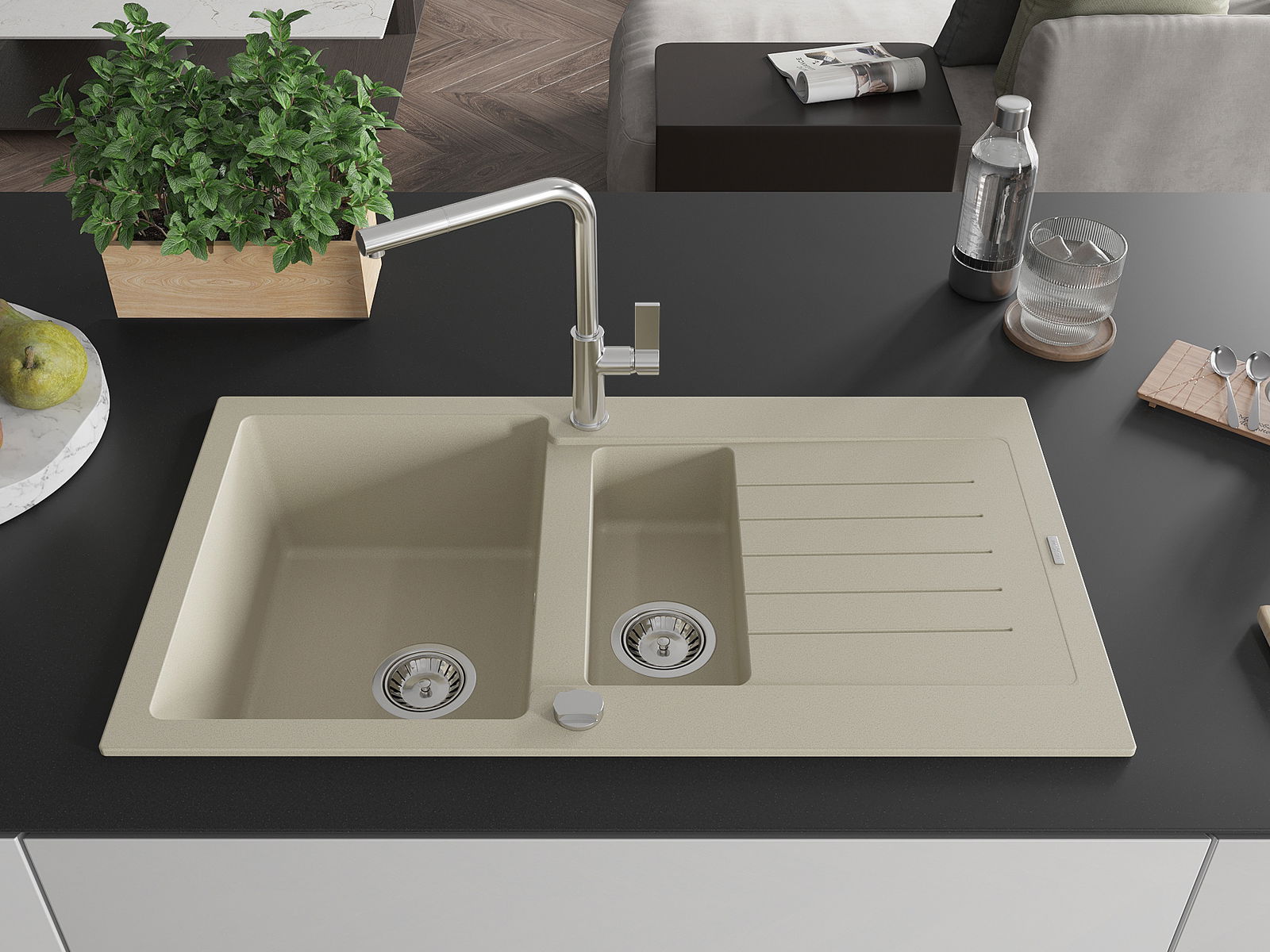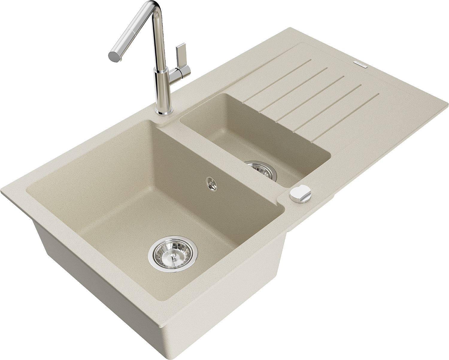 Mexen Matias évier en granit 1,5 cuves avec égouttoir et robinet de cuisine Flora, beige - 6502-69-670401-00