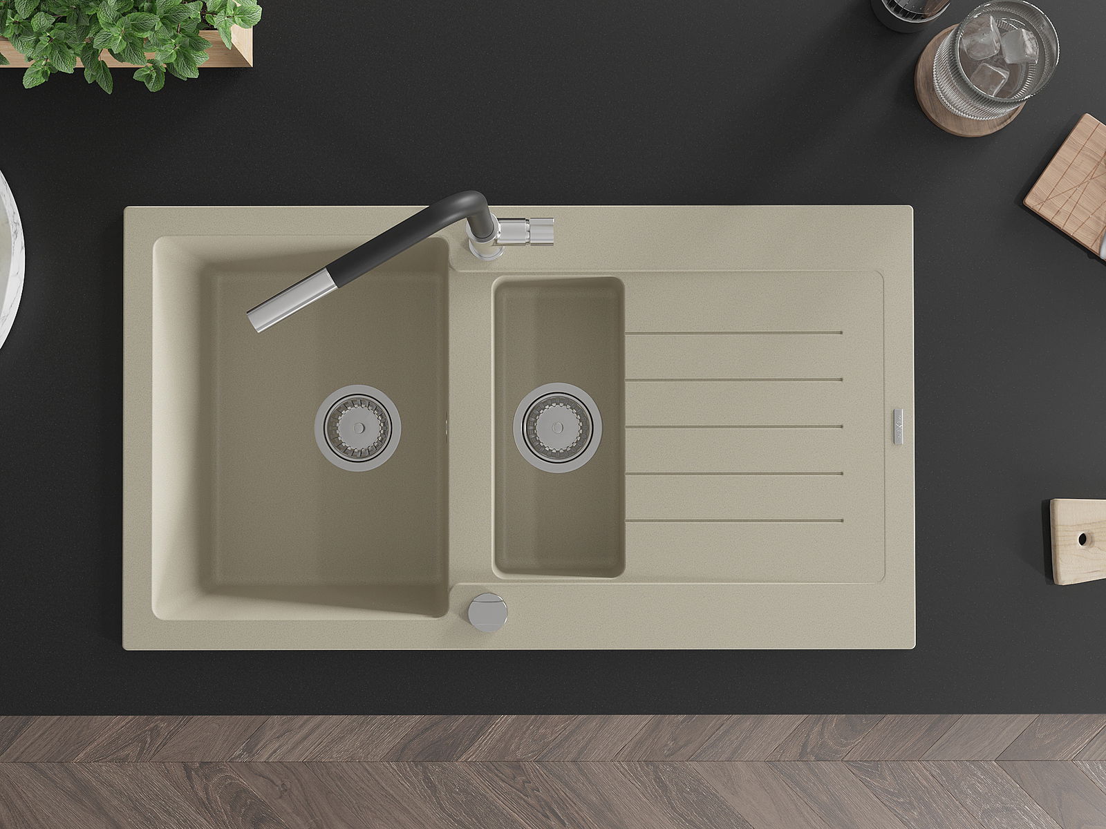 Mexen Matias évier en granit 1,5 bac avec égouttoir et mitigeur de cuisine Flora, beige - 6502-69-670401-07