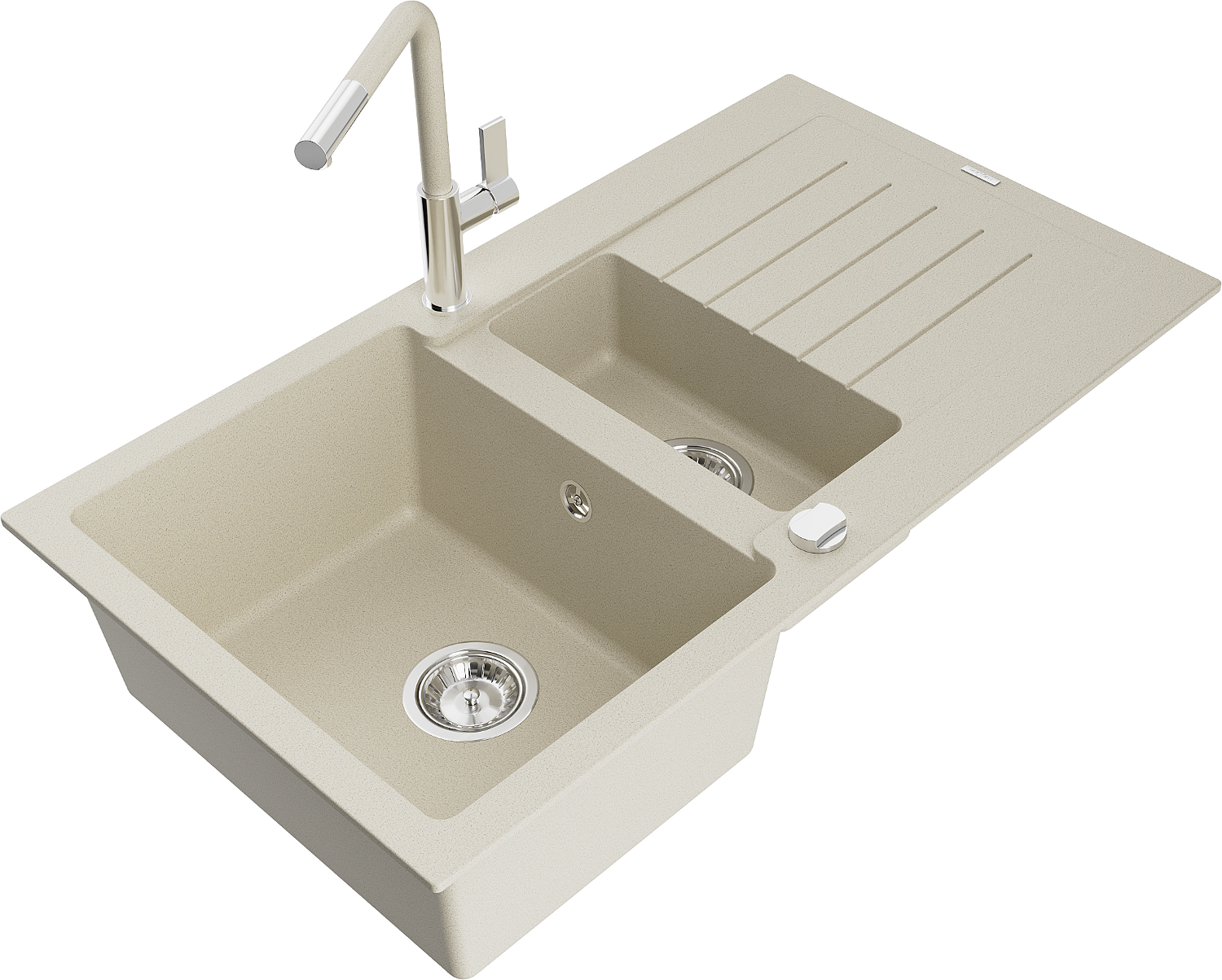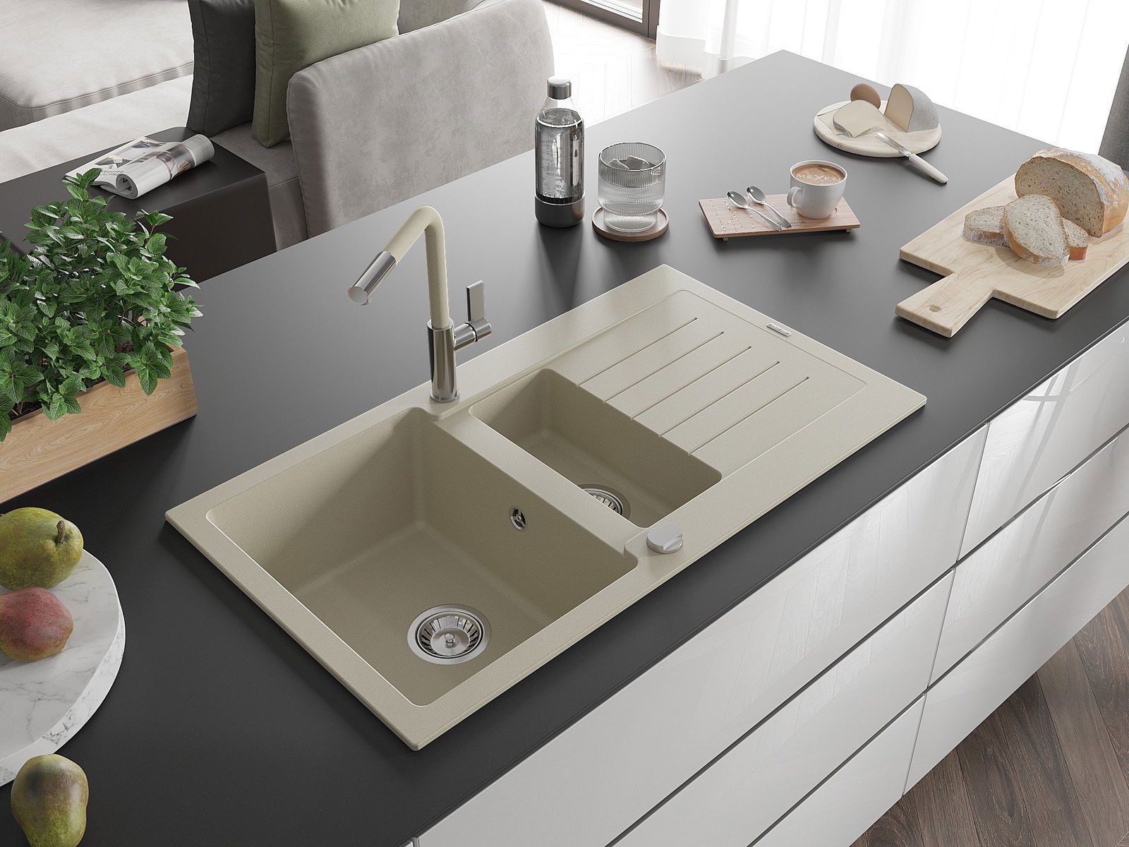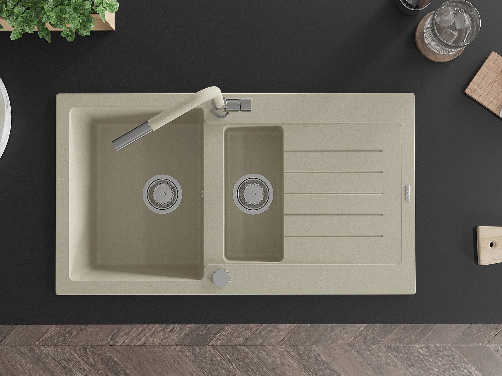 Mexen Matias évier en granit 1,5 bac avec égouttoir et robinet de cuisine Flora, beige - 6502-69-670401-09