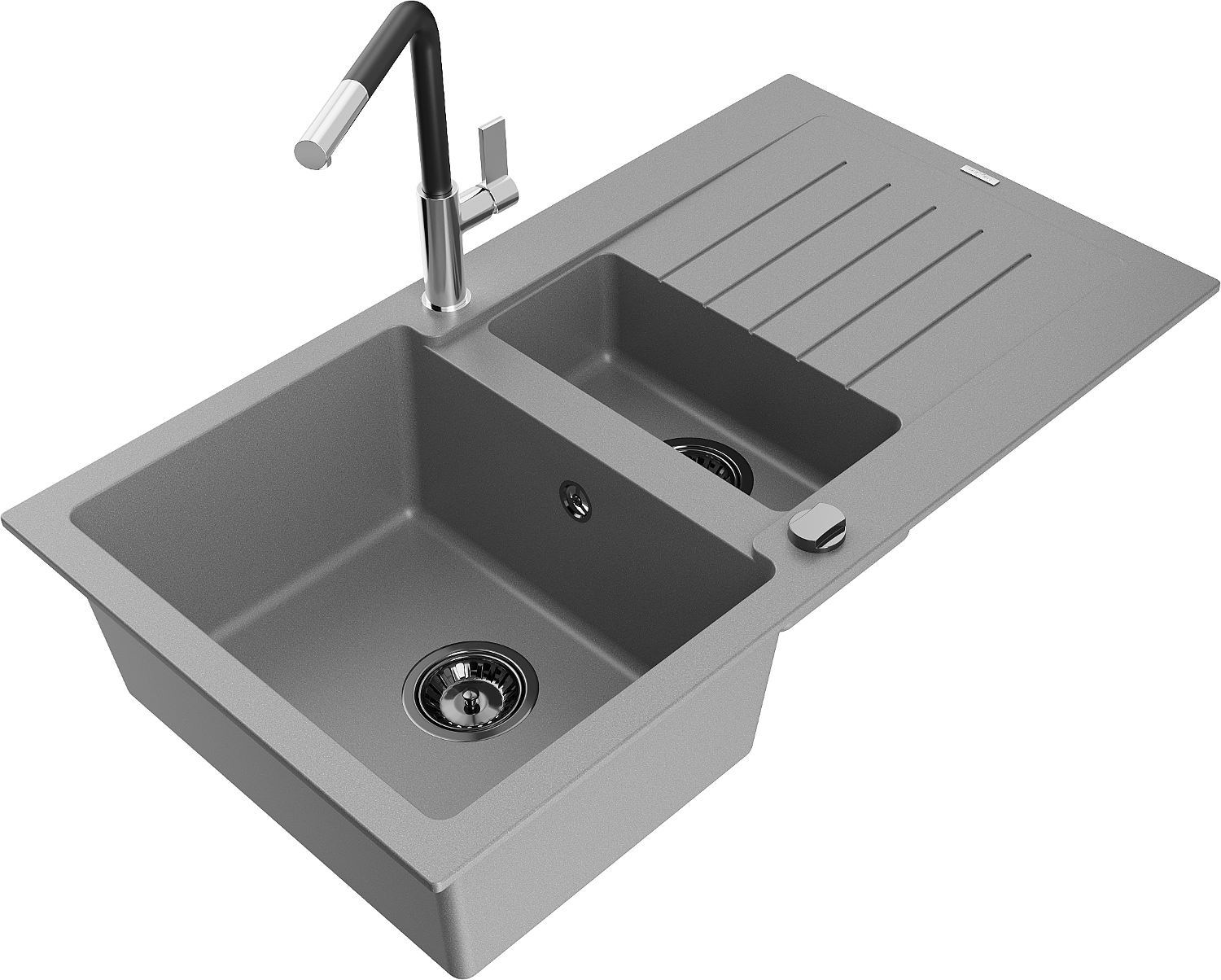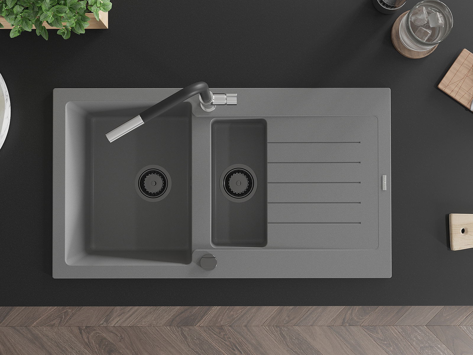Mexen Matias évier en granit 1,5 bac avec égouttoir et robinet de cuisine Flora, gris - 6502-71-670401-07-B