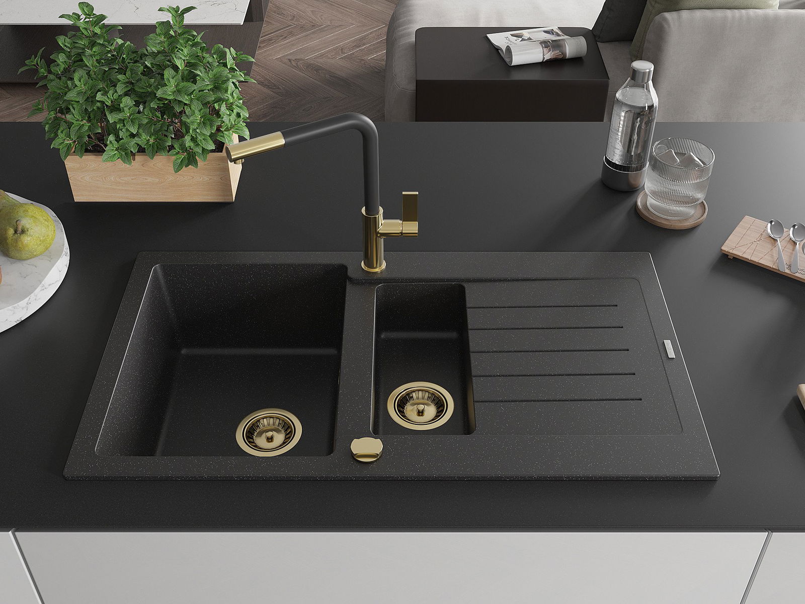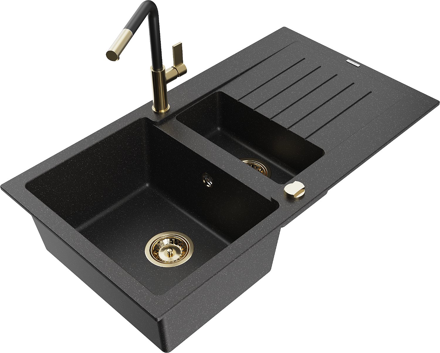 Mexen Matias évier en granit 1,5 bac avec égouttoir et mitigeur de cuisine Flora, noir/argent - 6502-73-670401-57-G