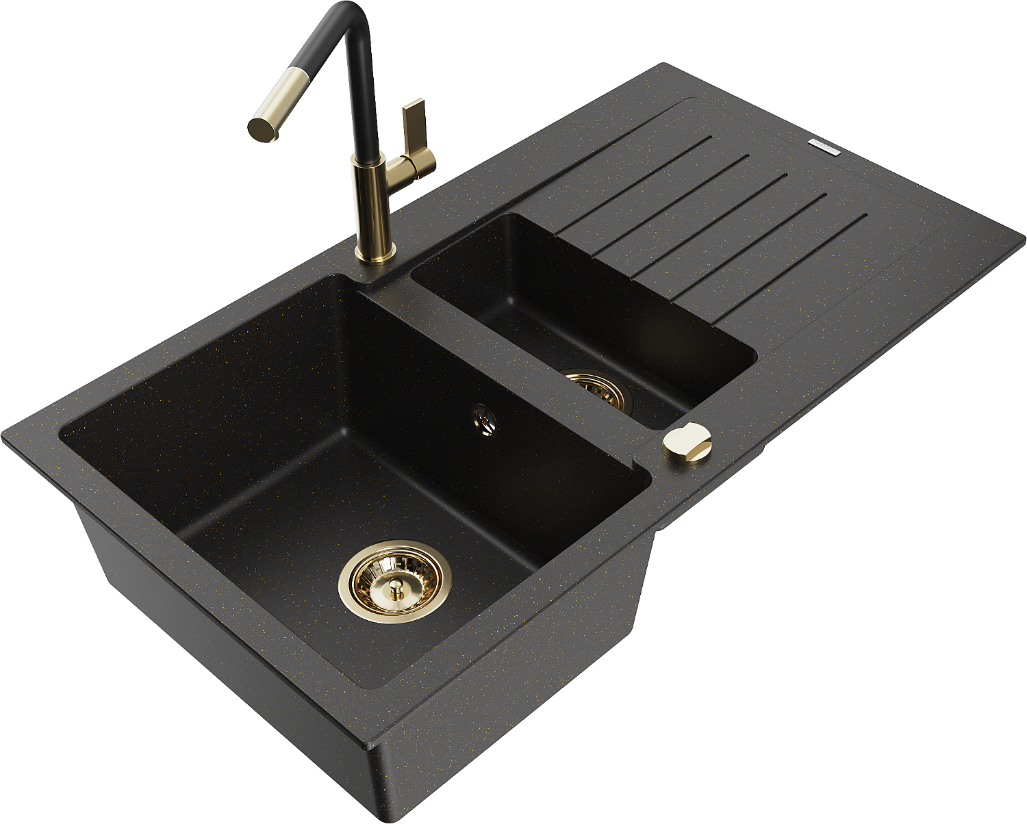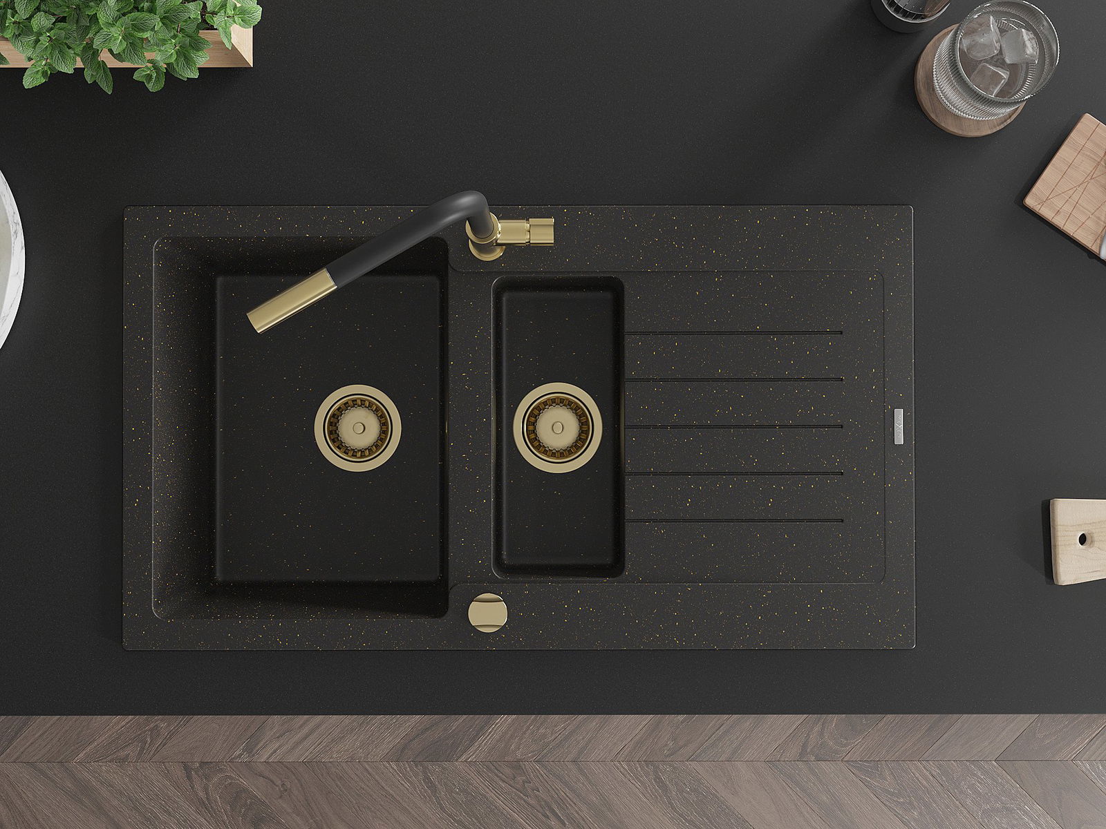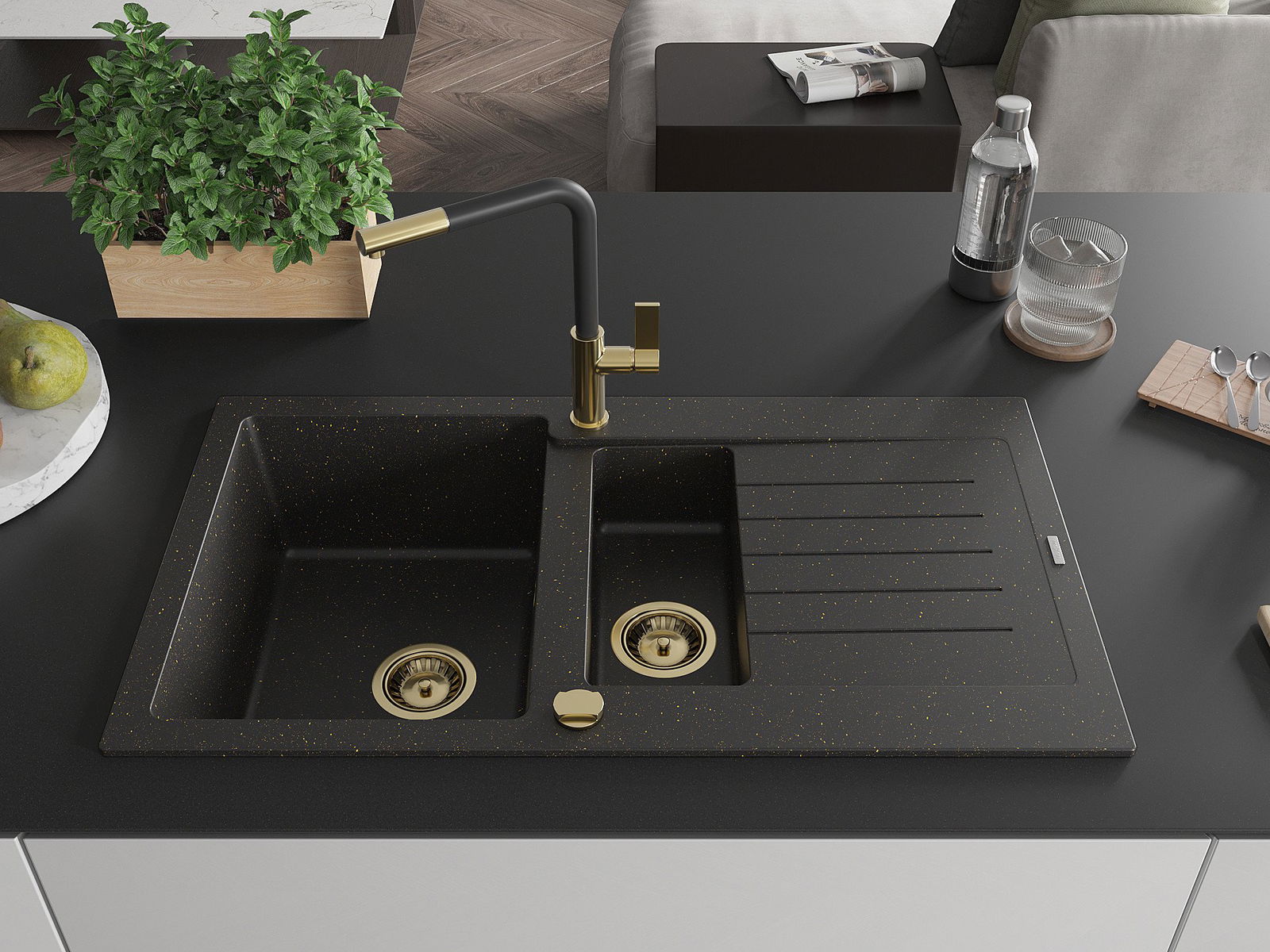 Mexen Matias évier en granit 1,5 bac avec égouttoir et robinet de cuisine Flora, noir/or - 6502-75-670401-57-G