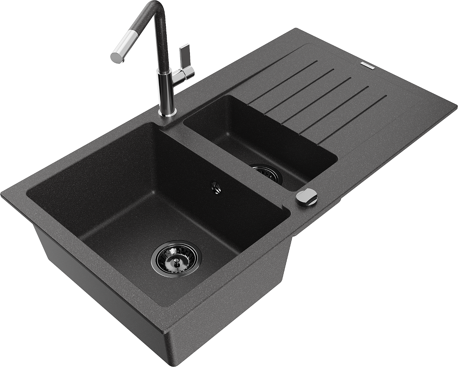 Mexen Matias évier en granit 1,5 bac avec égouttoir et robinet de cuisine Flora, noir tacheté - 6502-76-670401-08-B