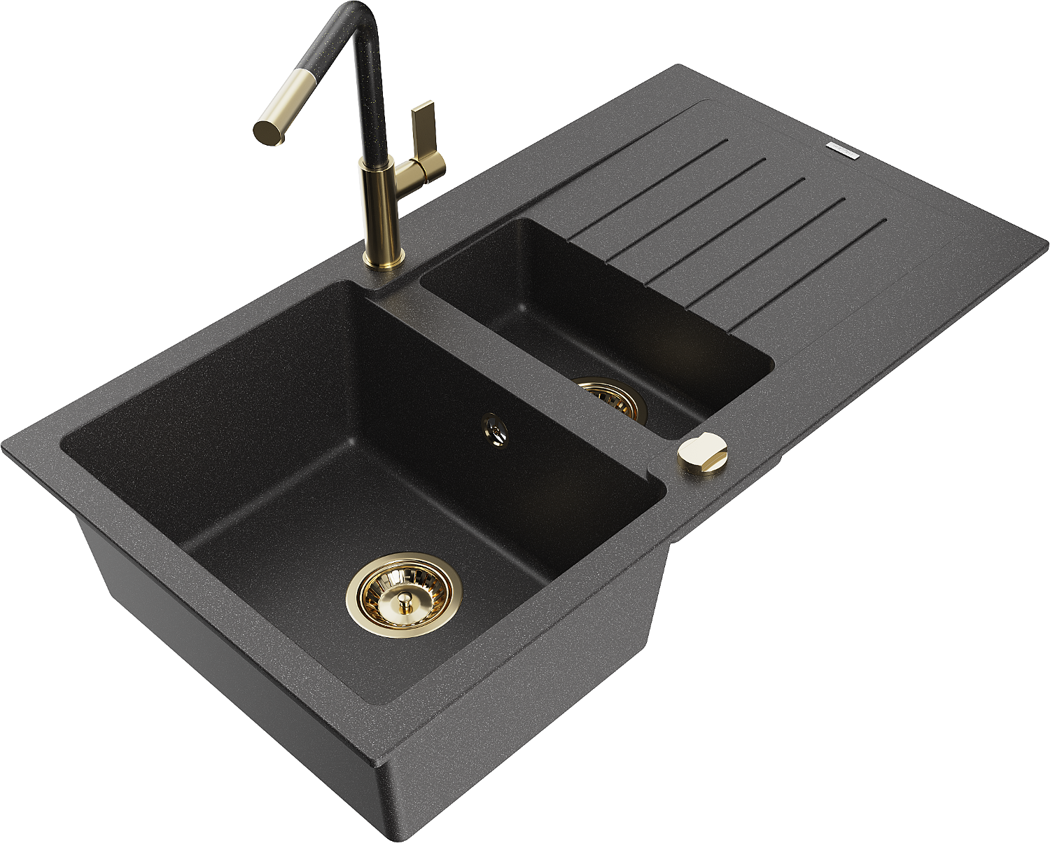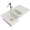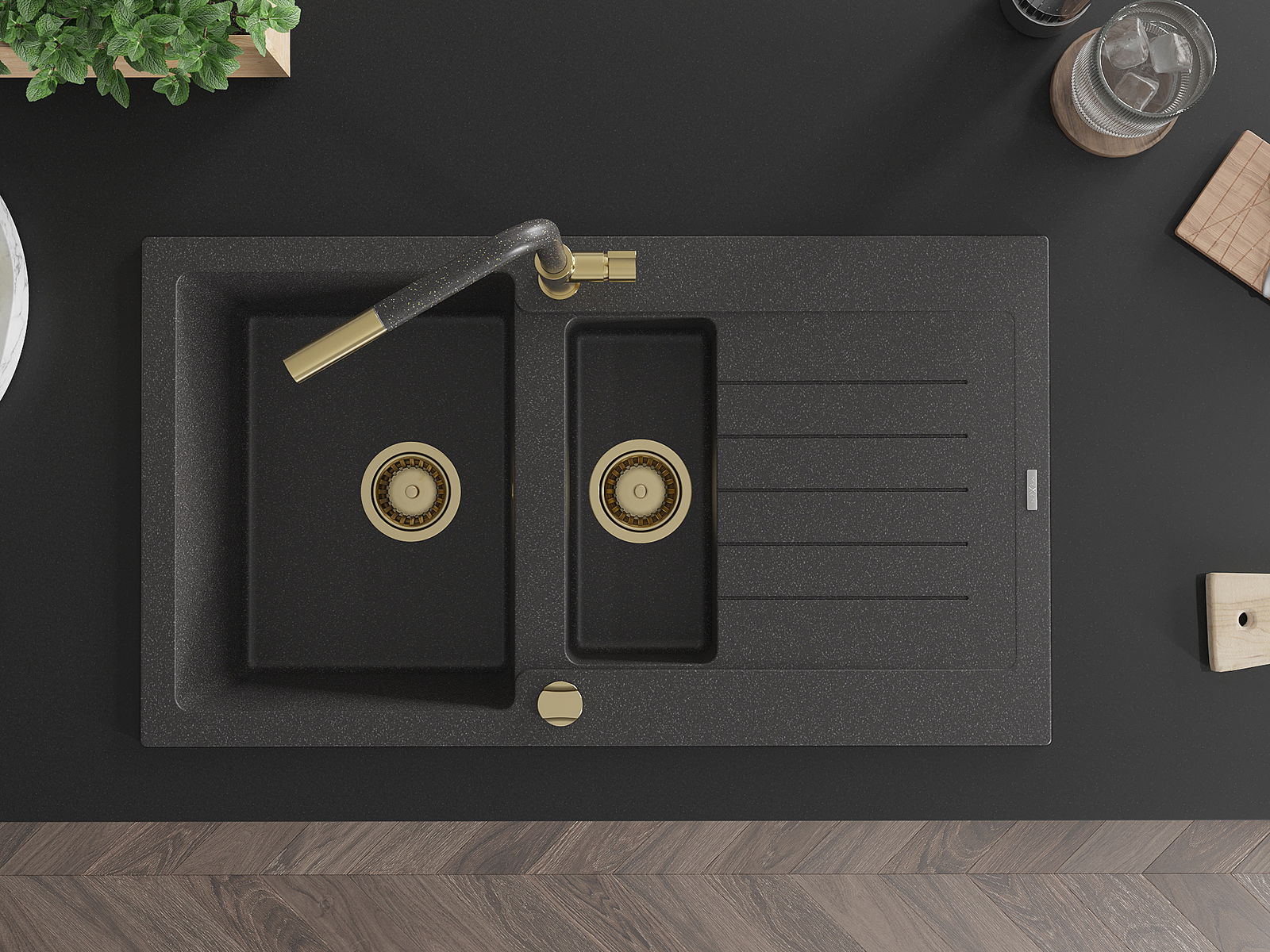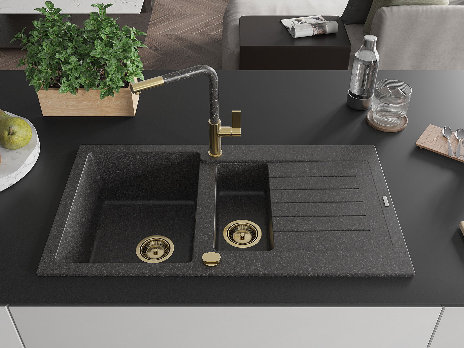 Mexen Matias évier en granit 1,5 bac avec égouttoir et mitigeur de cuisine Flora, noir moucheté - 6502-76-670401-75-G