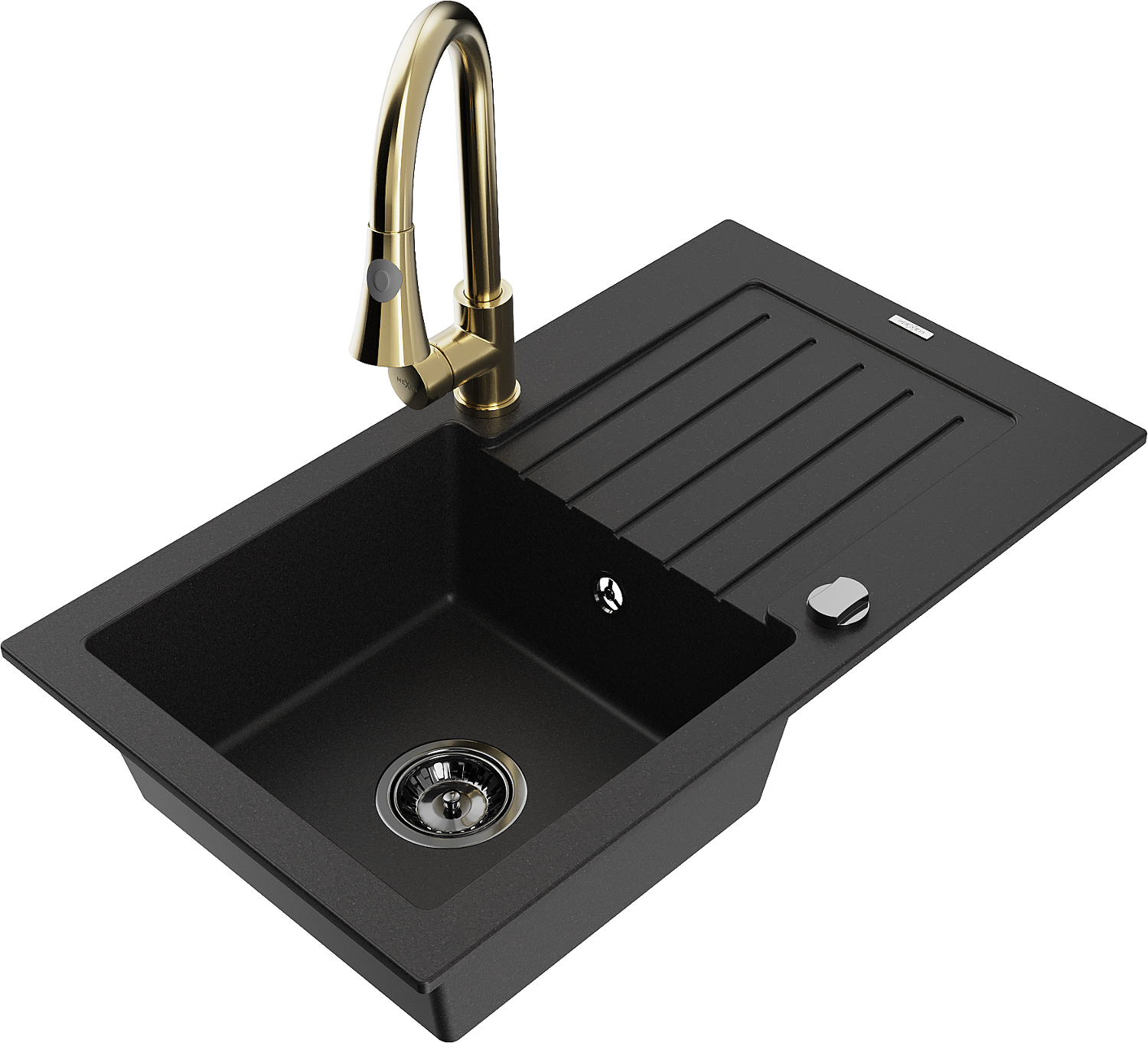 Mexen Pablo évier de cuisine en granit 1 bac avec égouttoir et robinetterie de cuisine Elia, noir - 6510-77-670101-50-B
