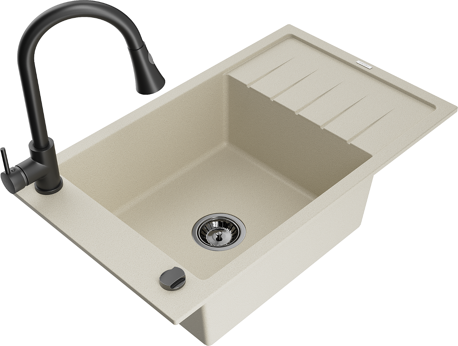 Mexen Elias évier en granit à 1 bac avec égouttoir et robinet de cuisine Elia, beige- 6511-69-670101-70