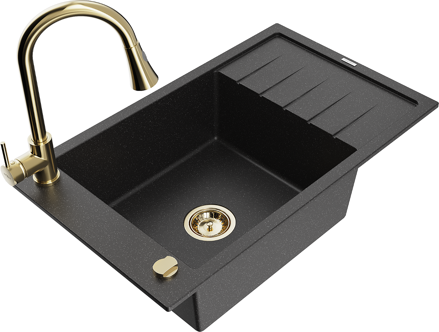 Mexen Elias évier en granit à 1 bac avec égouttoir et robinet de cuisine Elia, noir/métallisé argenté - 6511-73-670101-50