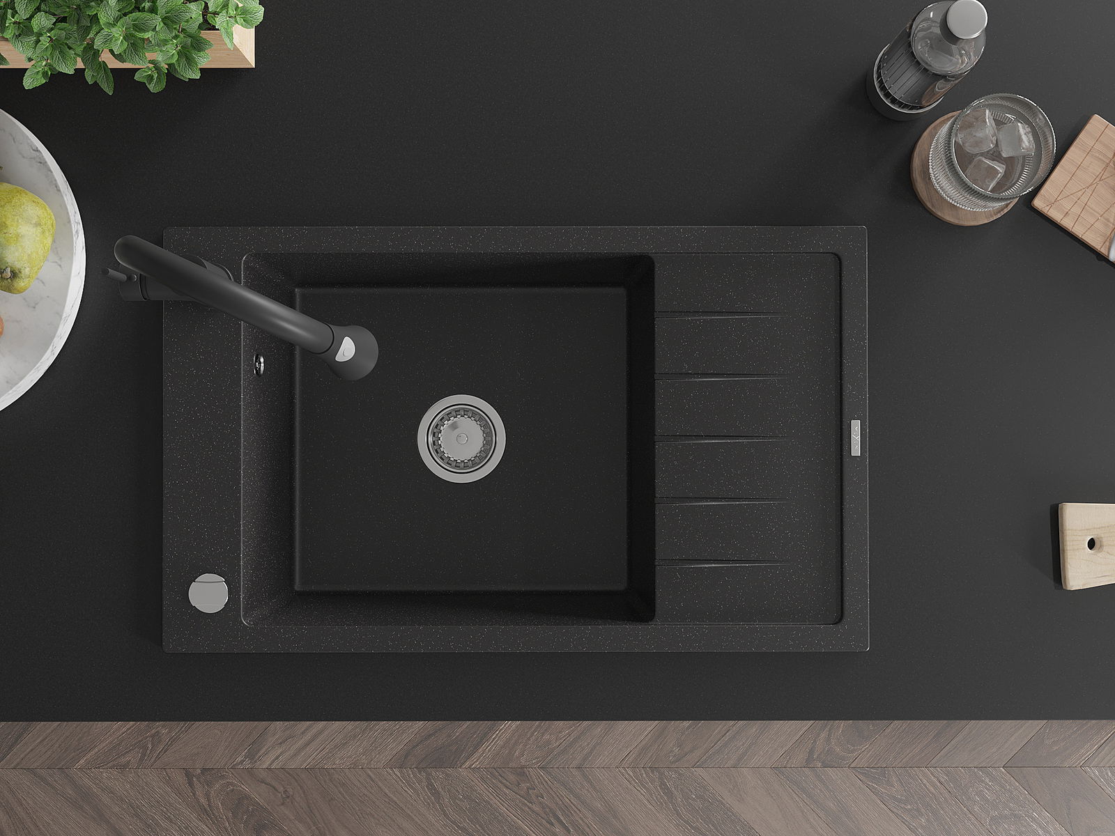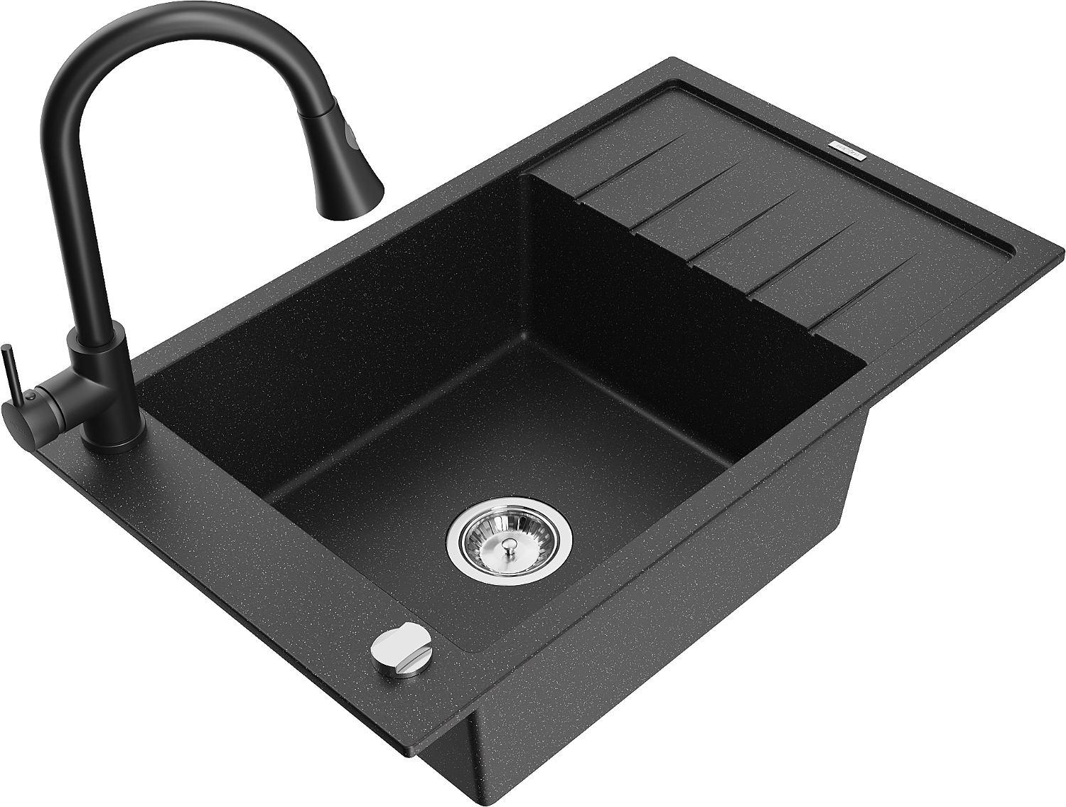 Mexen Elias évier en granit 1 bac avec égouttoir et robinet de cuisine Elia, noir/métallique argenté - 6511-73-670101-70