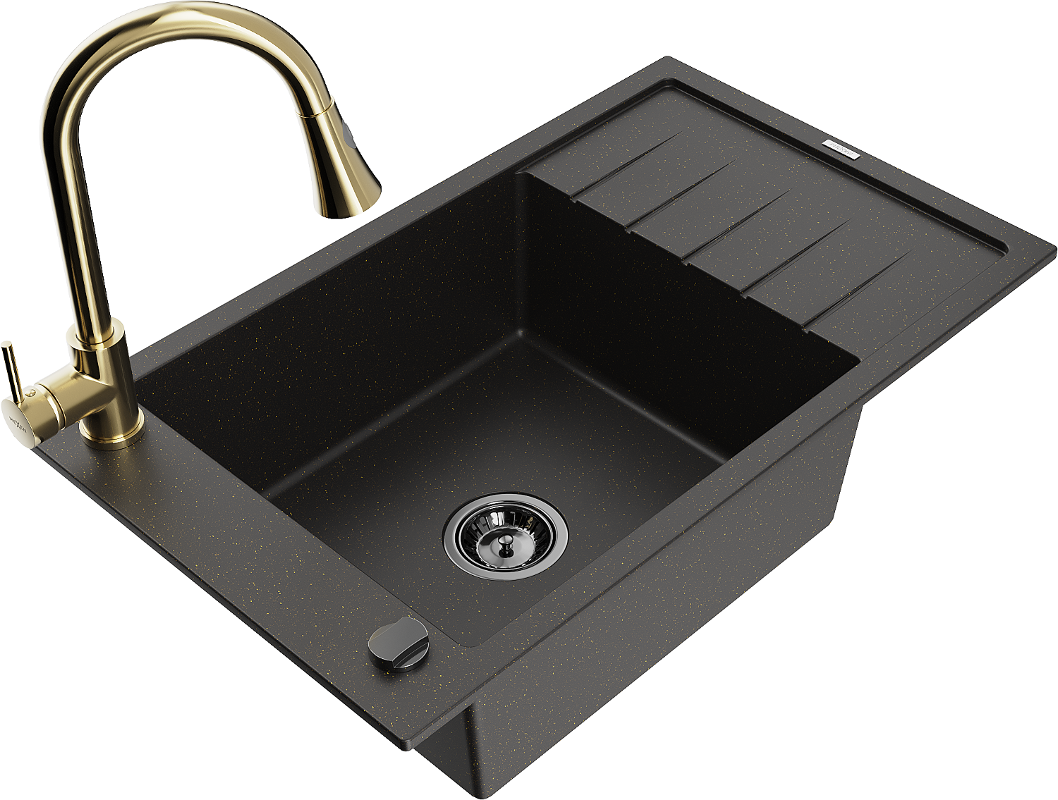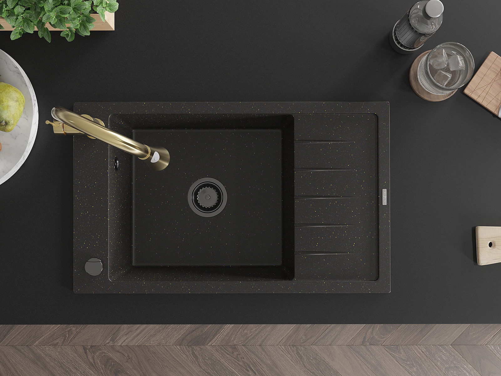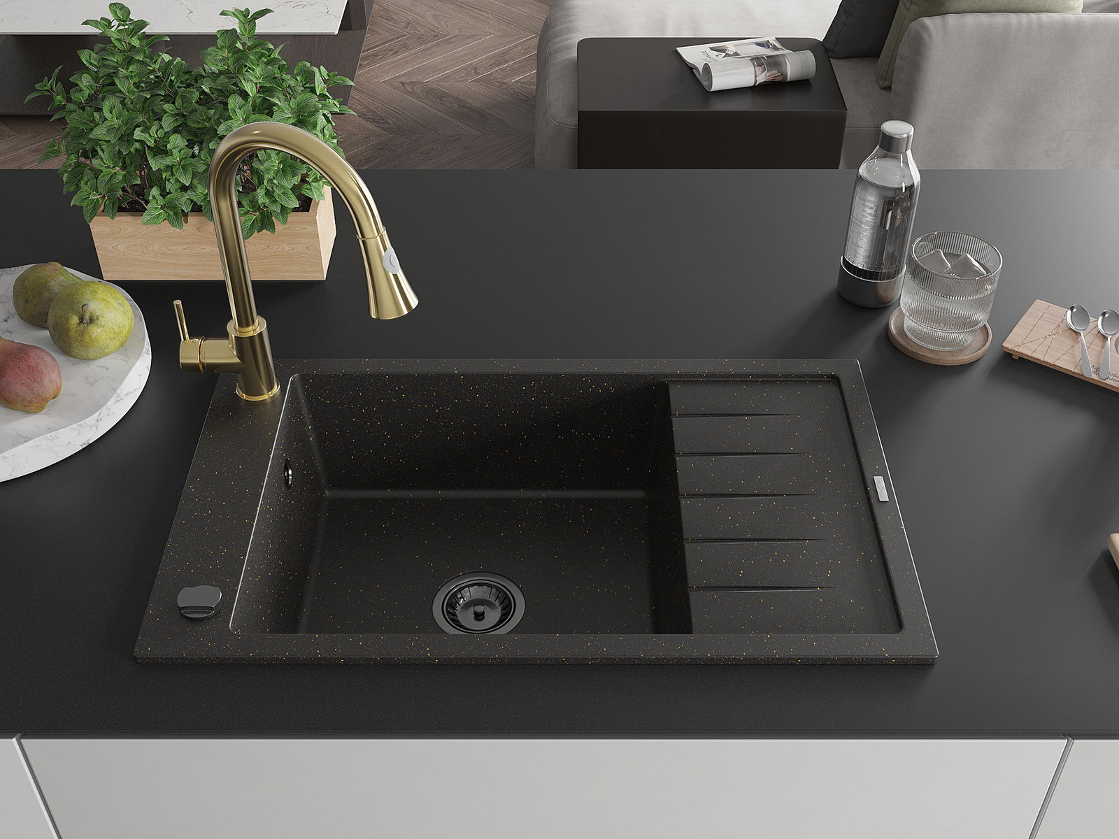 Mexen Elias évier en granit à 1 cuve avec égouttoir et robinet de cuisine Elia, noir/doré métallique - 6511-75-670101-50-B