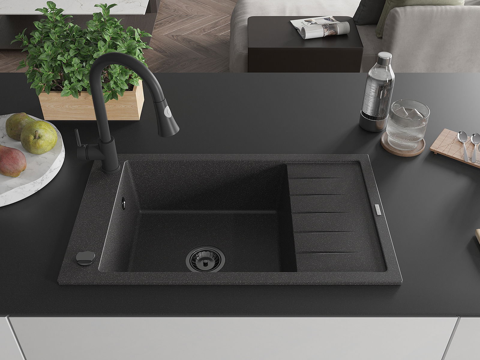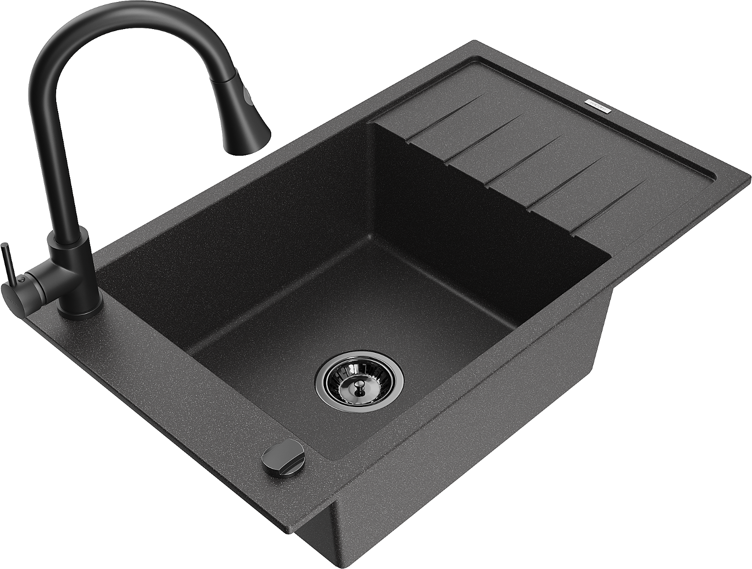 Evier en granit Mexen Elias 1 bac avec égouttoir et robinet de cuisine Elia, noir moucheté - 6511-76-670101-70-B
