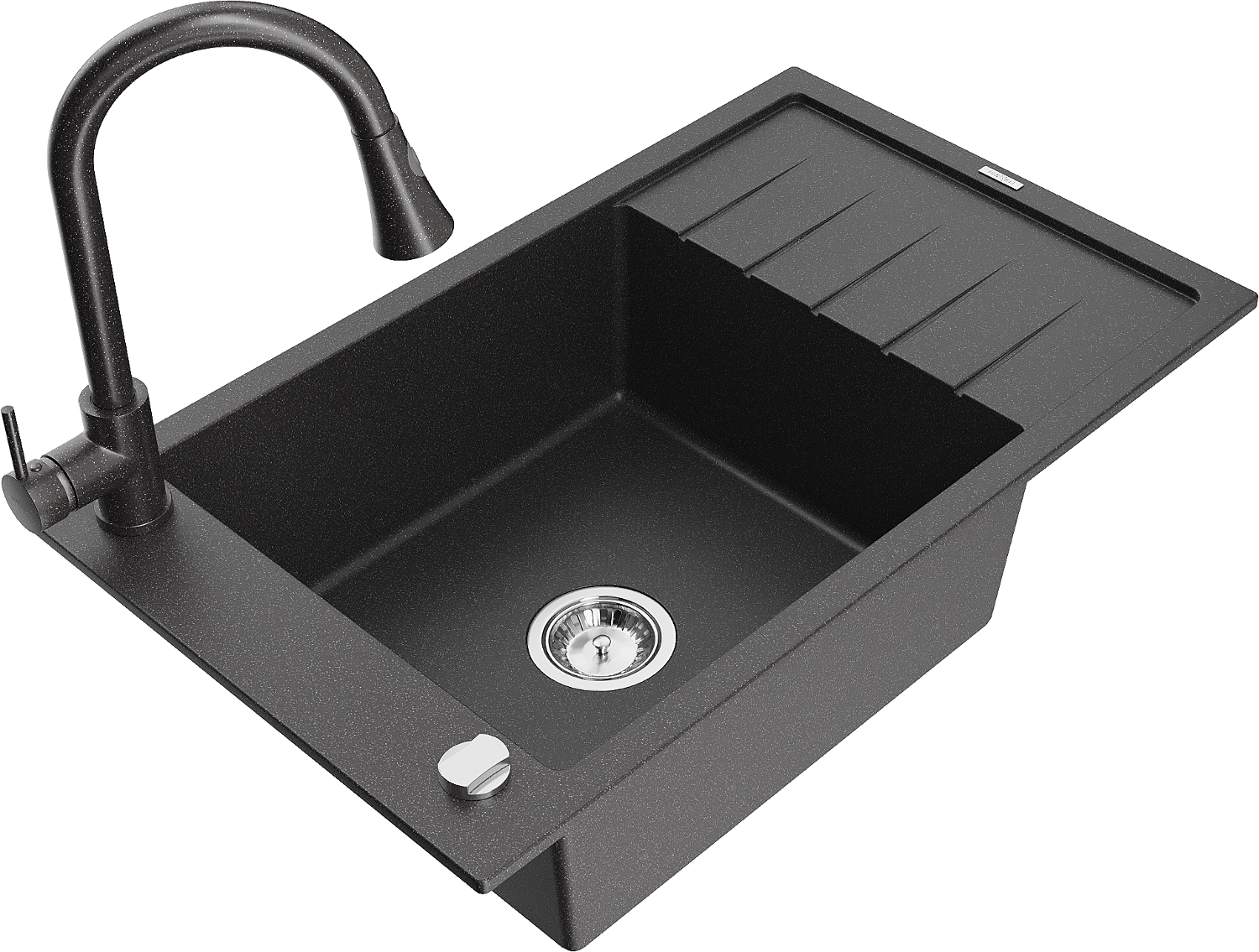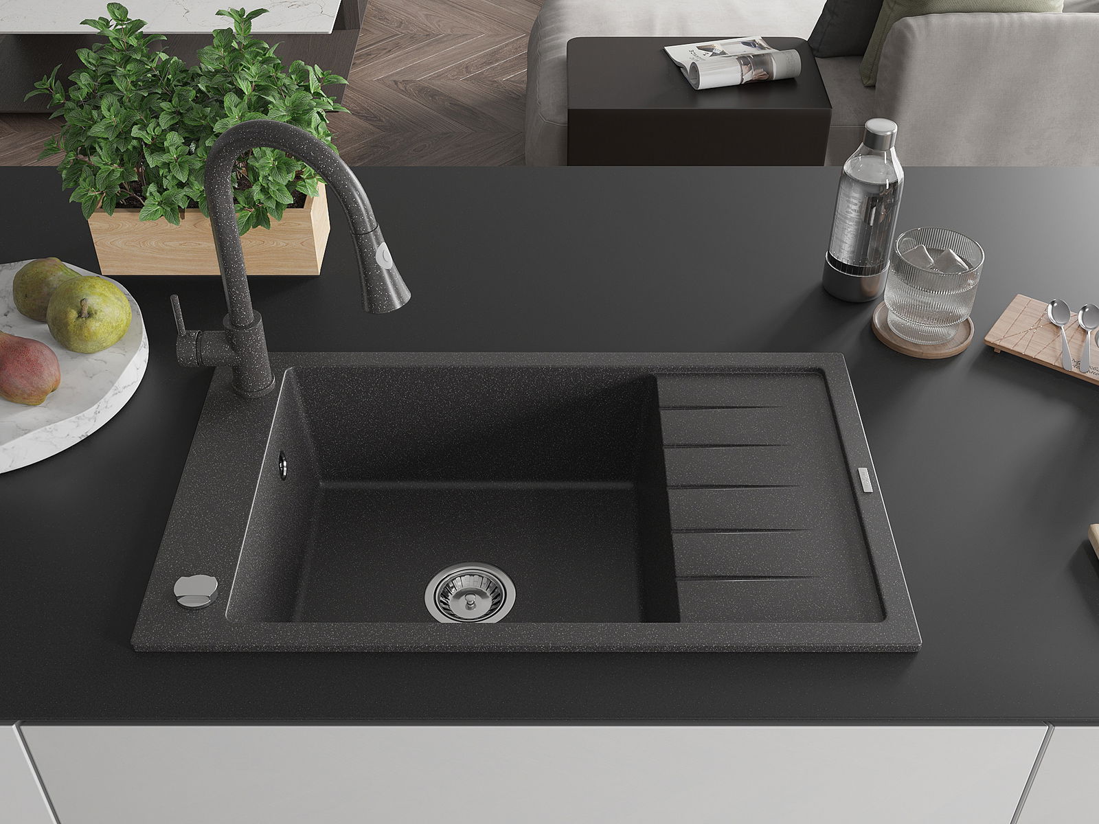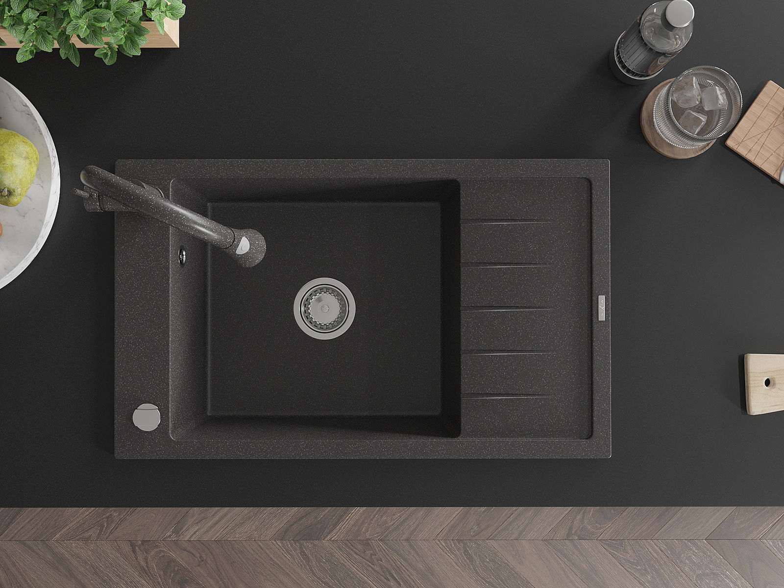 Mexen Elias évier de cuisine en granit 1 bac avec égouttoir et mitigeur Elia, noir moucheté - 6511-76-670101-76