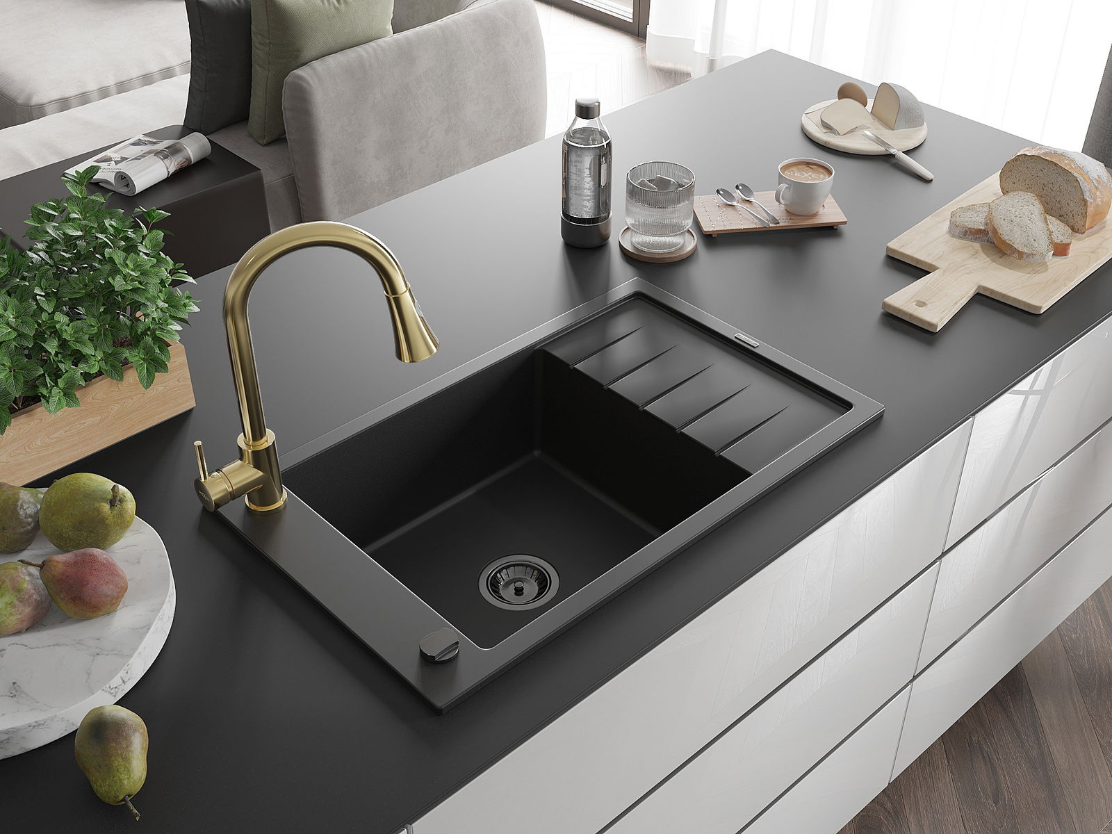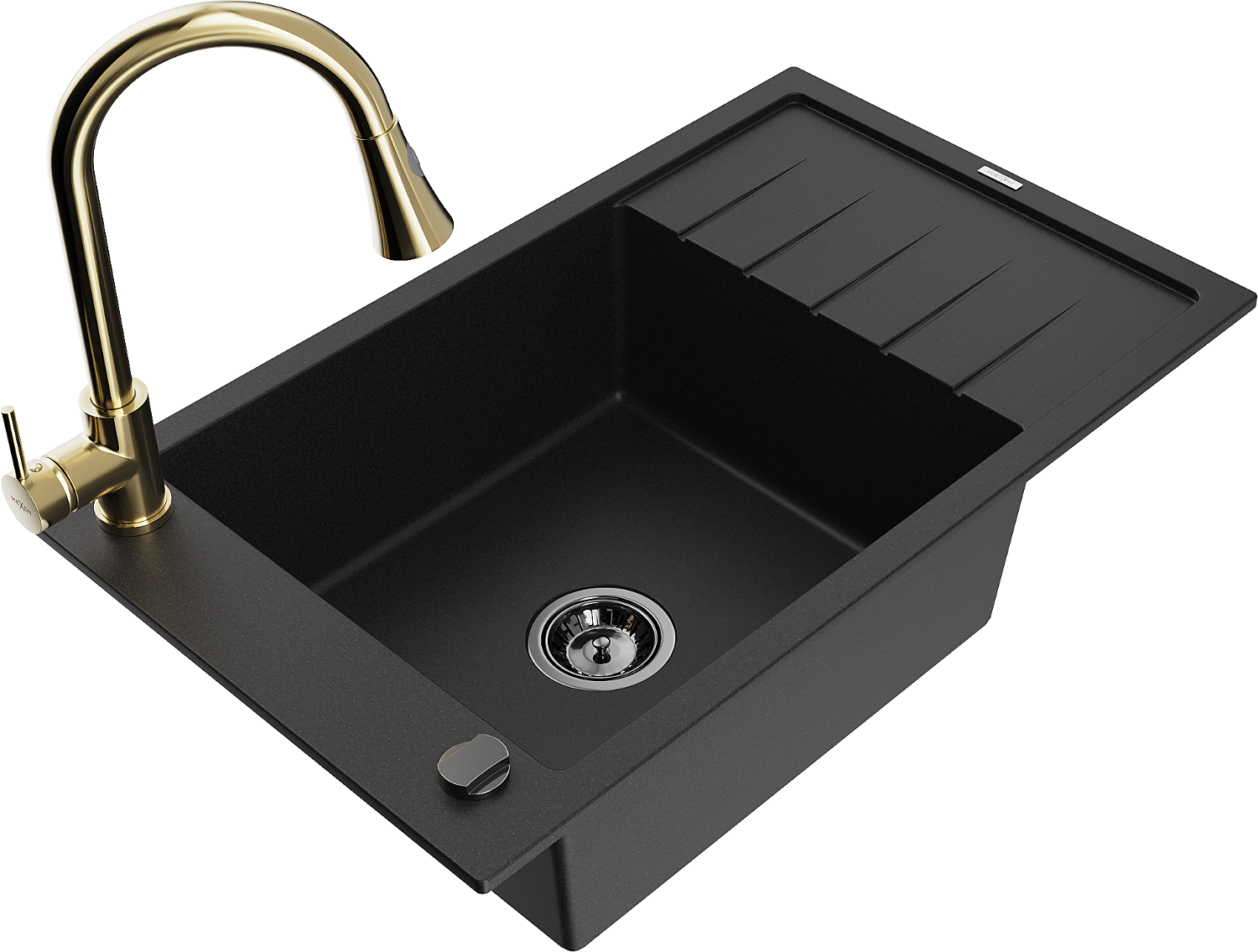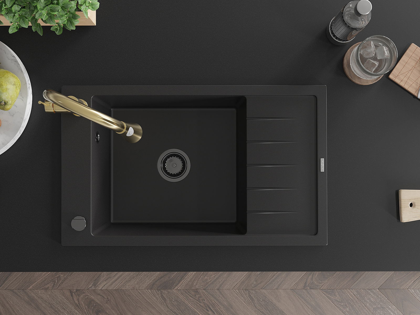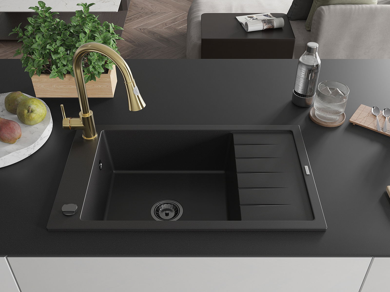Mexen Elias évier en granit 1 bac avec égouttoir et robinet de cuisine Elia, noir - 6511-77-670101-50-B