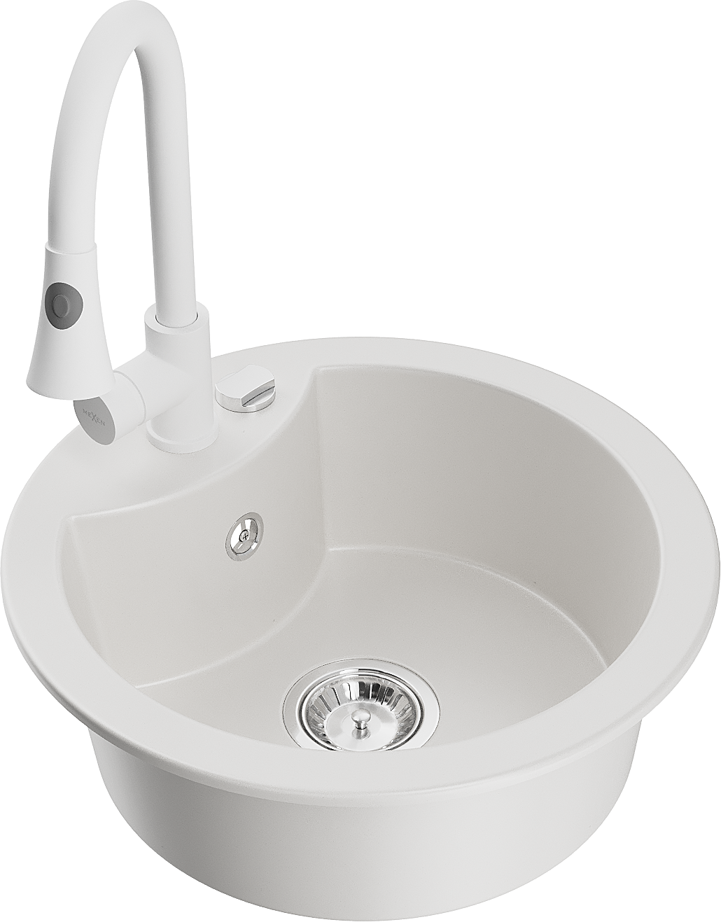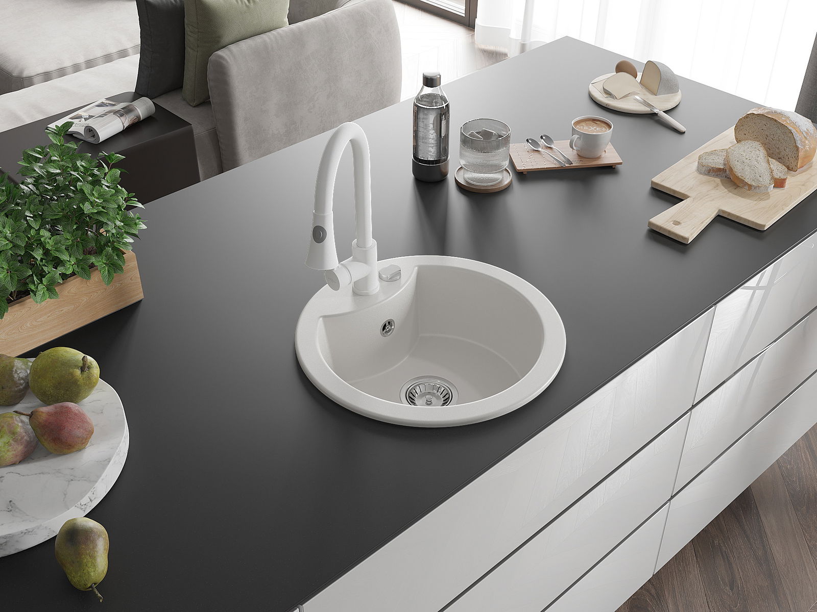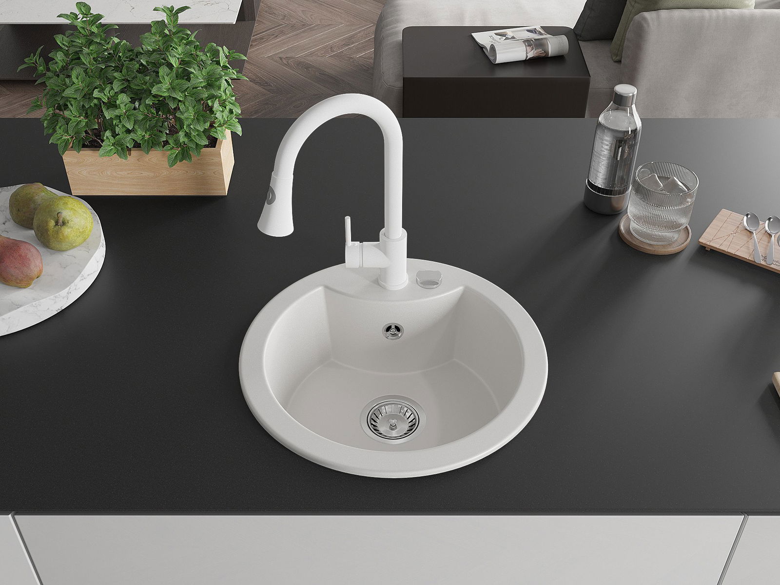 Mexen Diego évier en granit à 1 bac avec robinet de cuisine Elia, blanc - 6512-20-670101-20