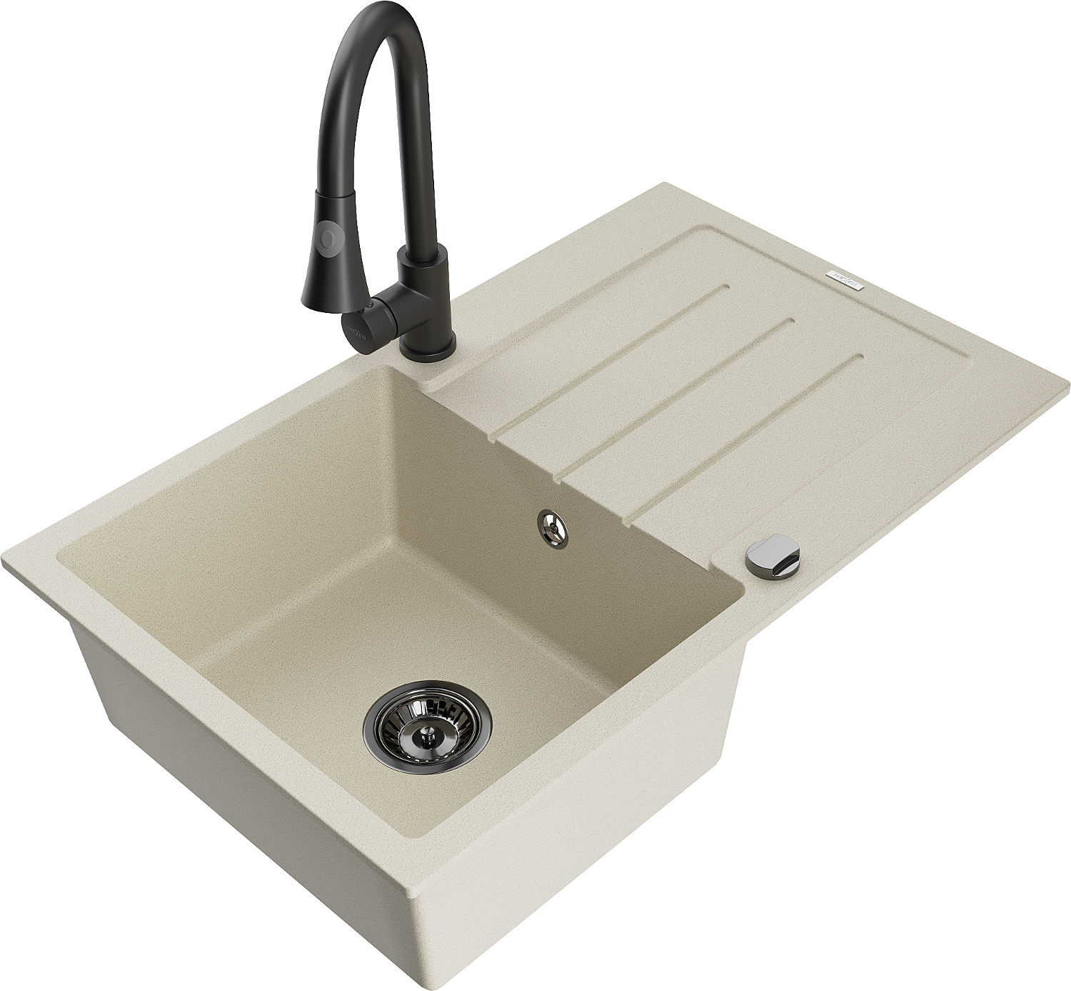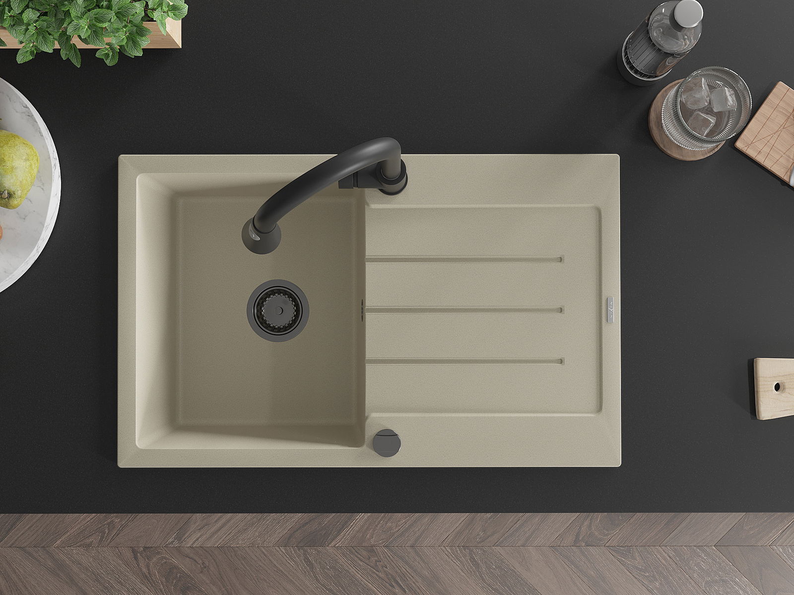 Mexen Bruno évier de cuisine 1 bac en granit avec égouttoir et mitigeur de cuisine Elia, beige - 6513-69-670101-70