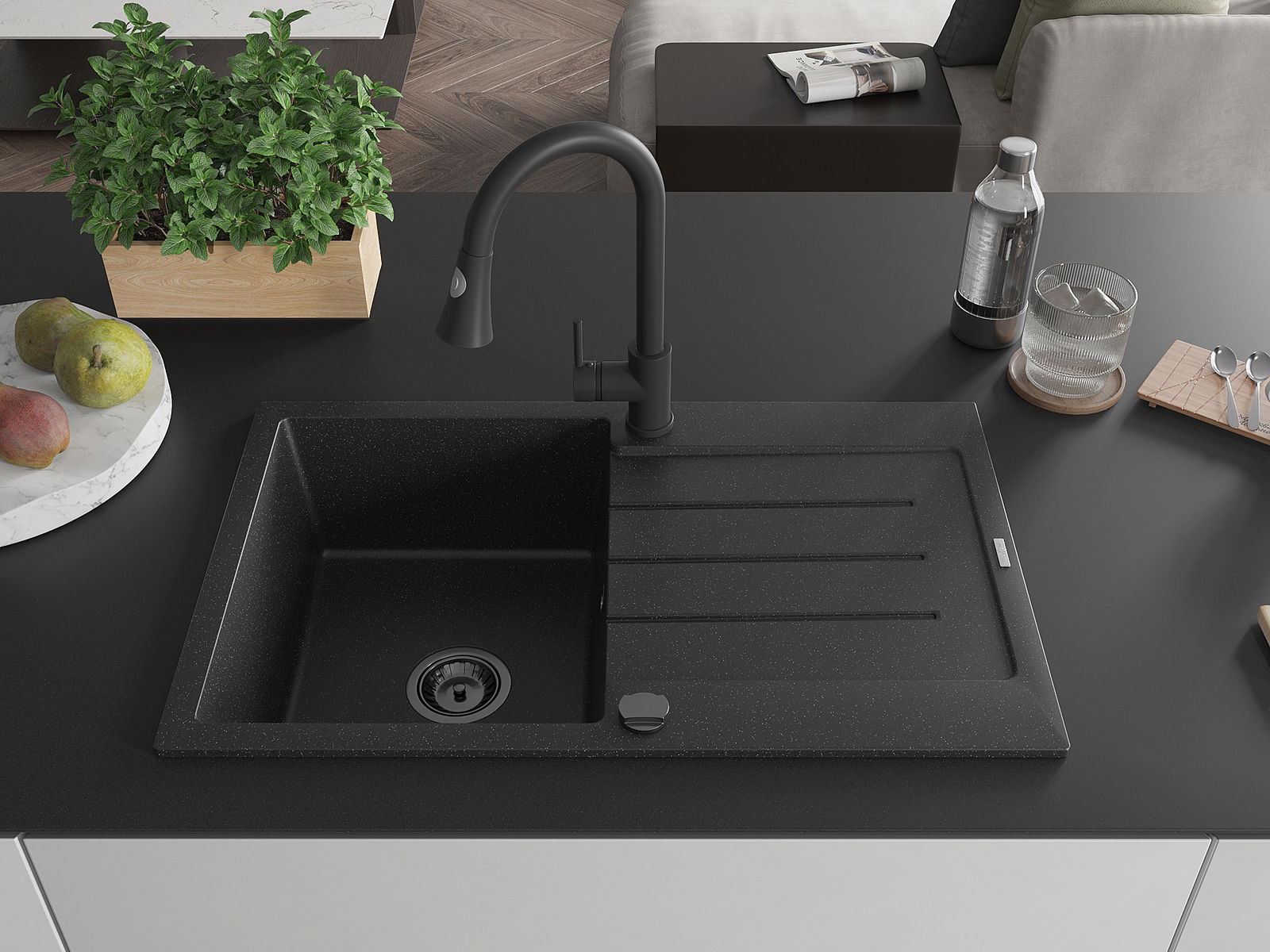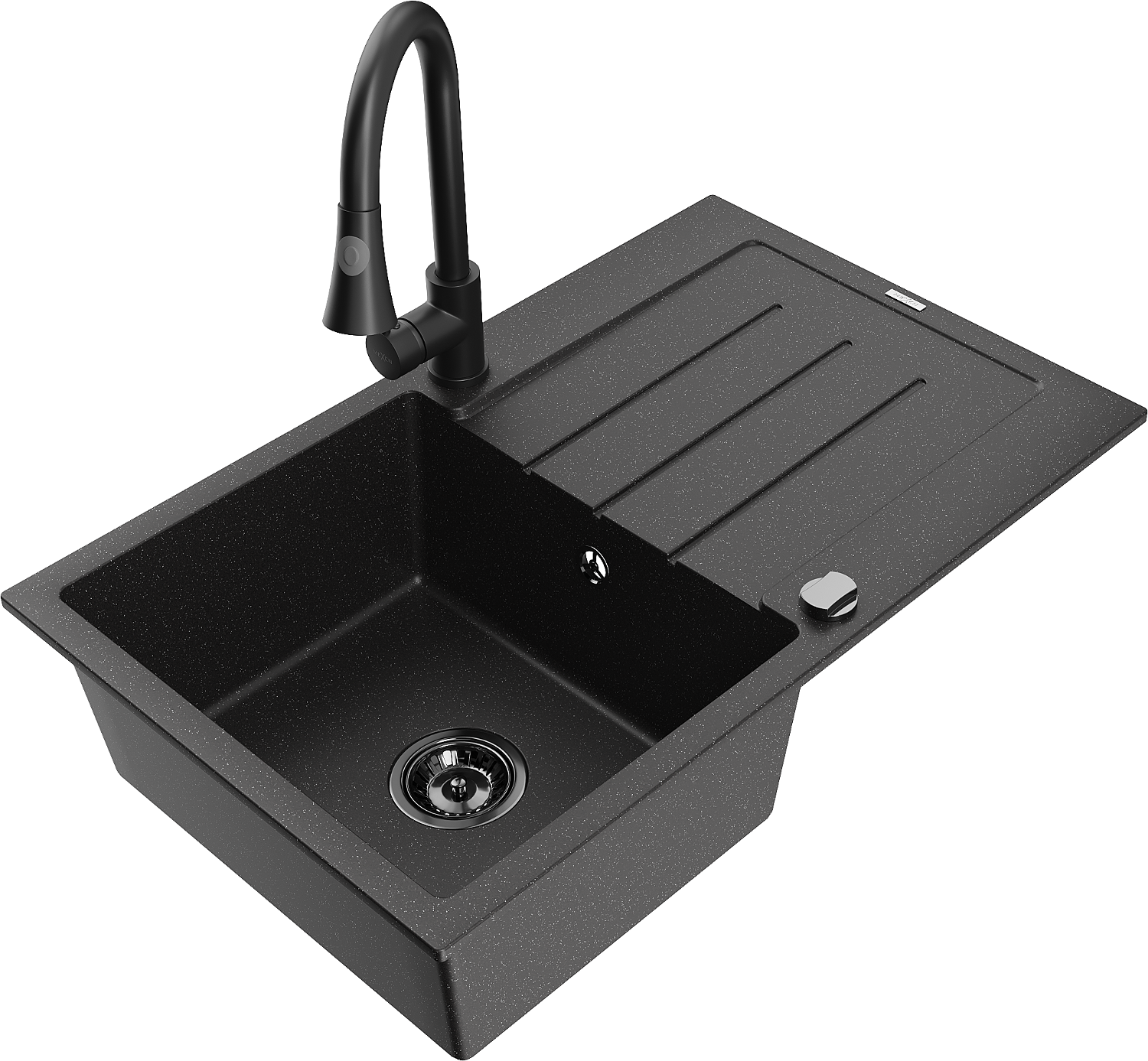 Mexen Bruno évier en granit 1 bac avec égouttoir et robinet de cuisine Elia, noir/argent métallisé - 6513-73-670101-70-B