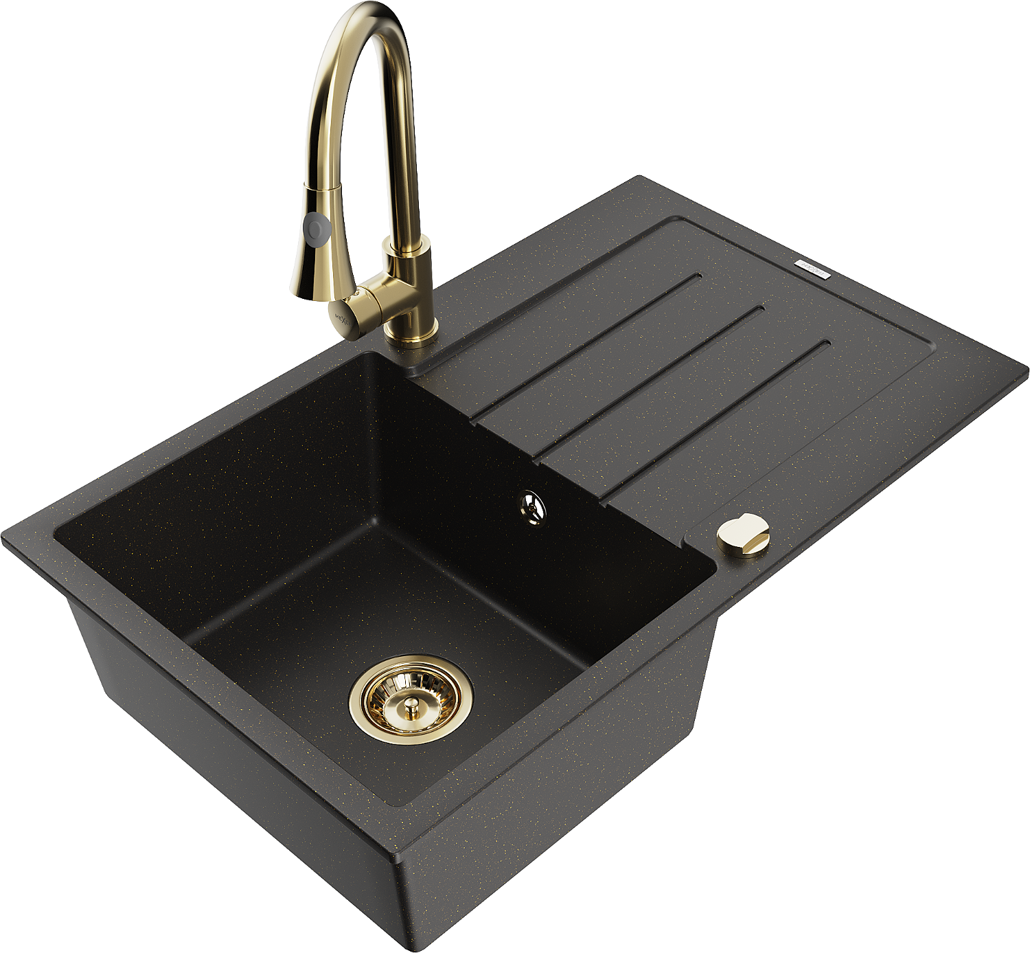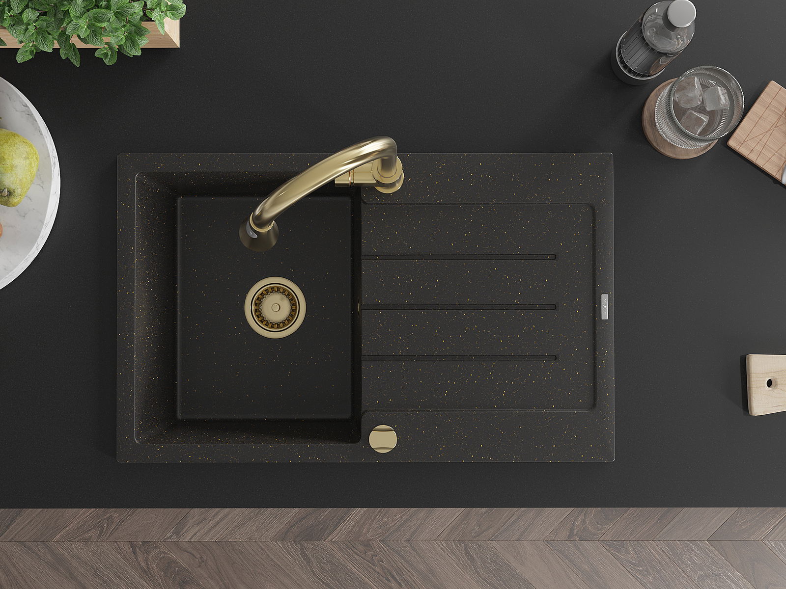 Mexen Bruno évier en granit 1 bac avec égouttoir et robinet de cuisine Elia, noir/métallisé or - 6513-75-670101-50