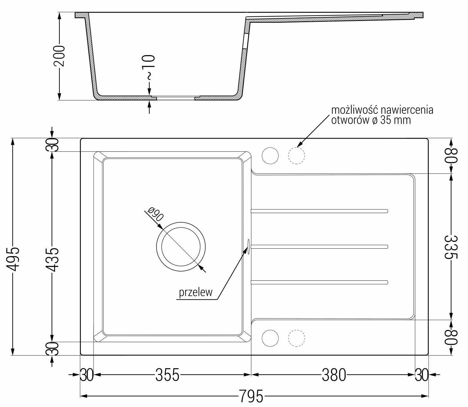 L'évier dispose de 2 trous pré-percés de 35 mm de diamètre, à percer soi-même. Ils peuvent être utilisés, entre autres, pour l'installation d'un distributeur de liquide, qui éliminera la présence de bouteilles en plastique dans la cuisine et lui donnera une finition élégante.