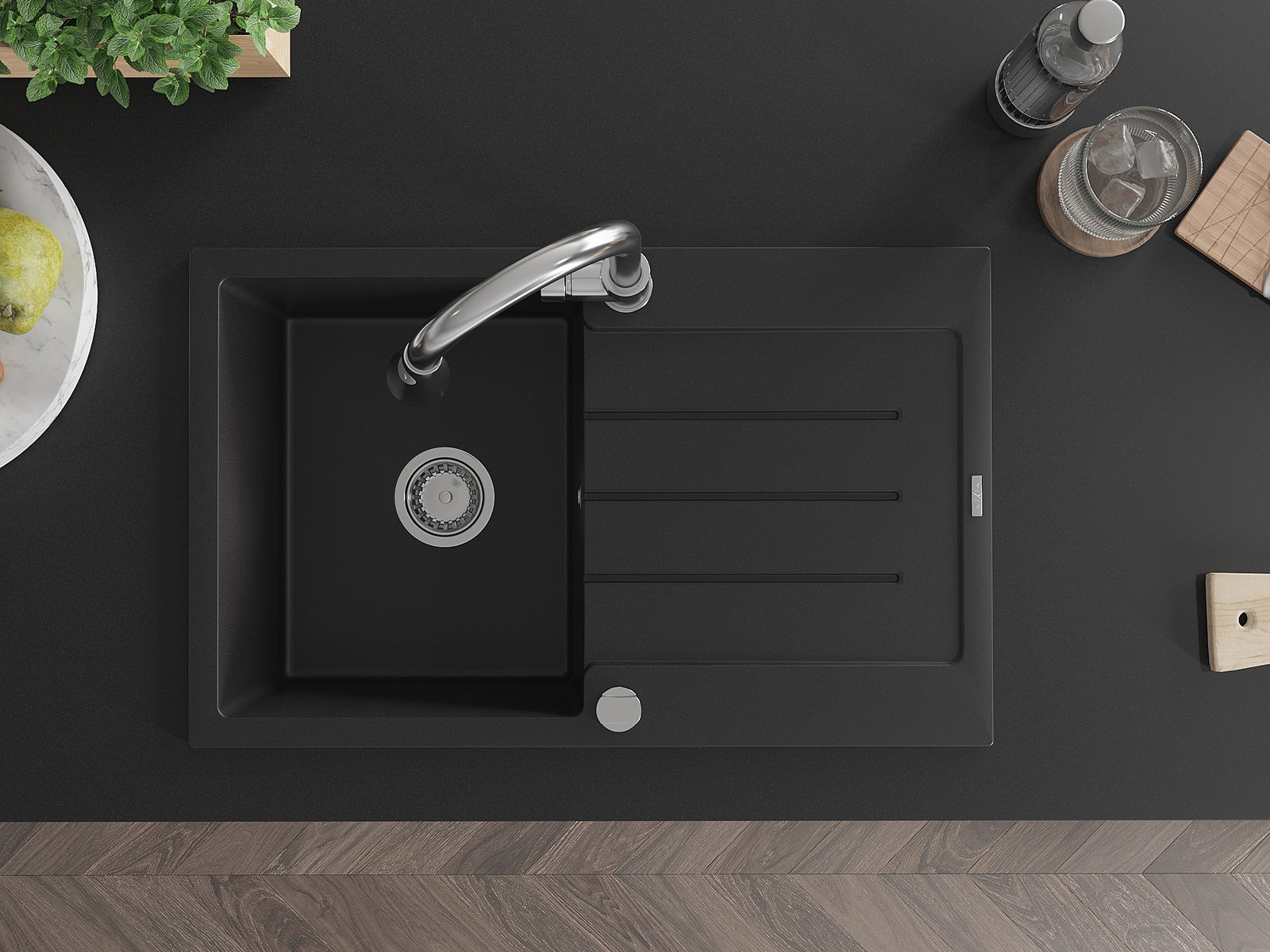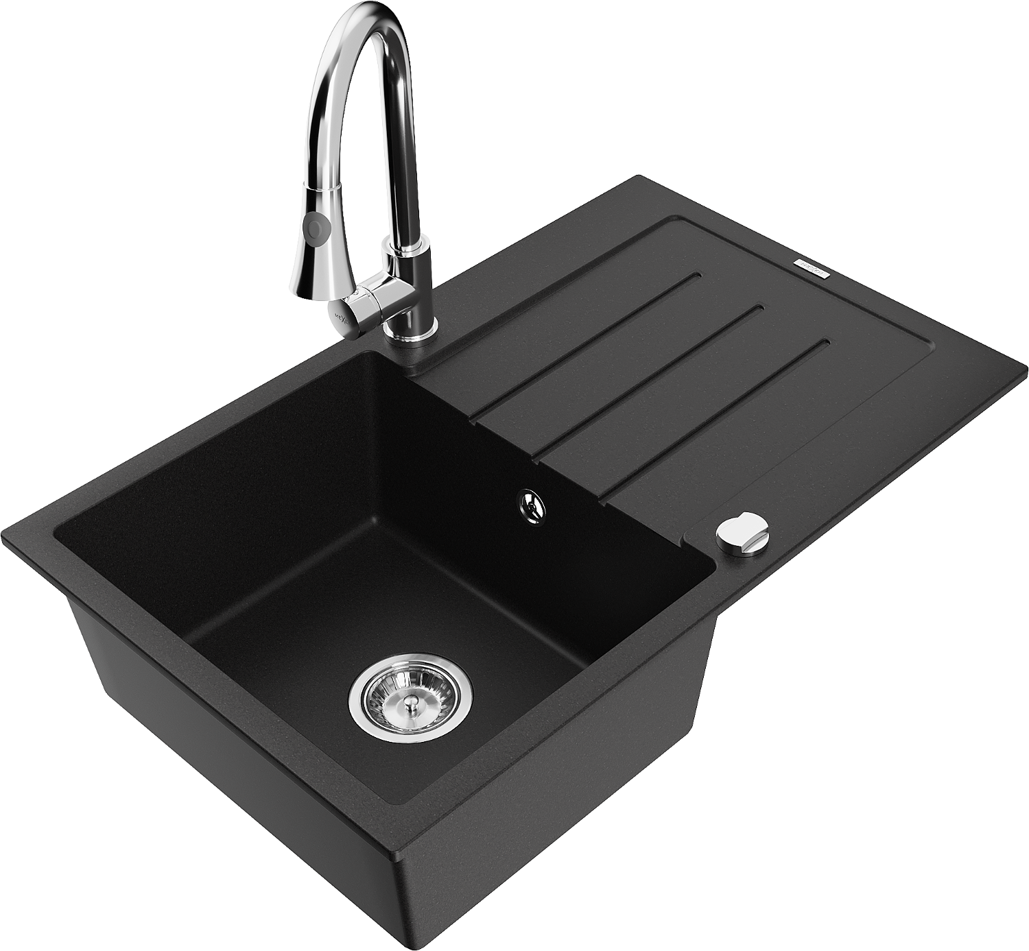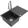Mexen Bruno évier en granit 1 bac avec égouttoir et robinet de cuisine Elia, noir - 6513-77-670101-00