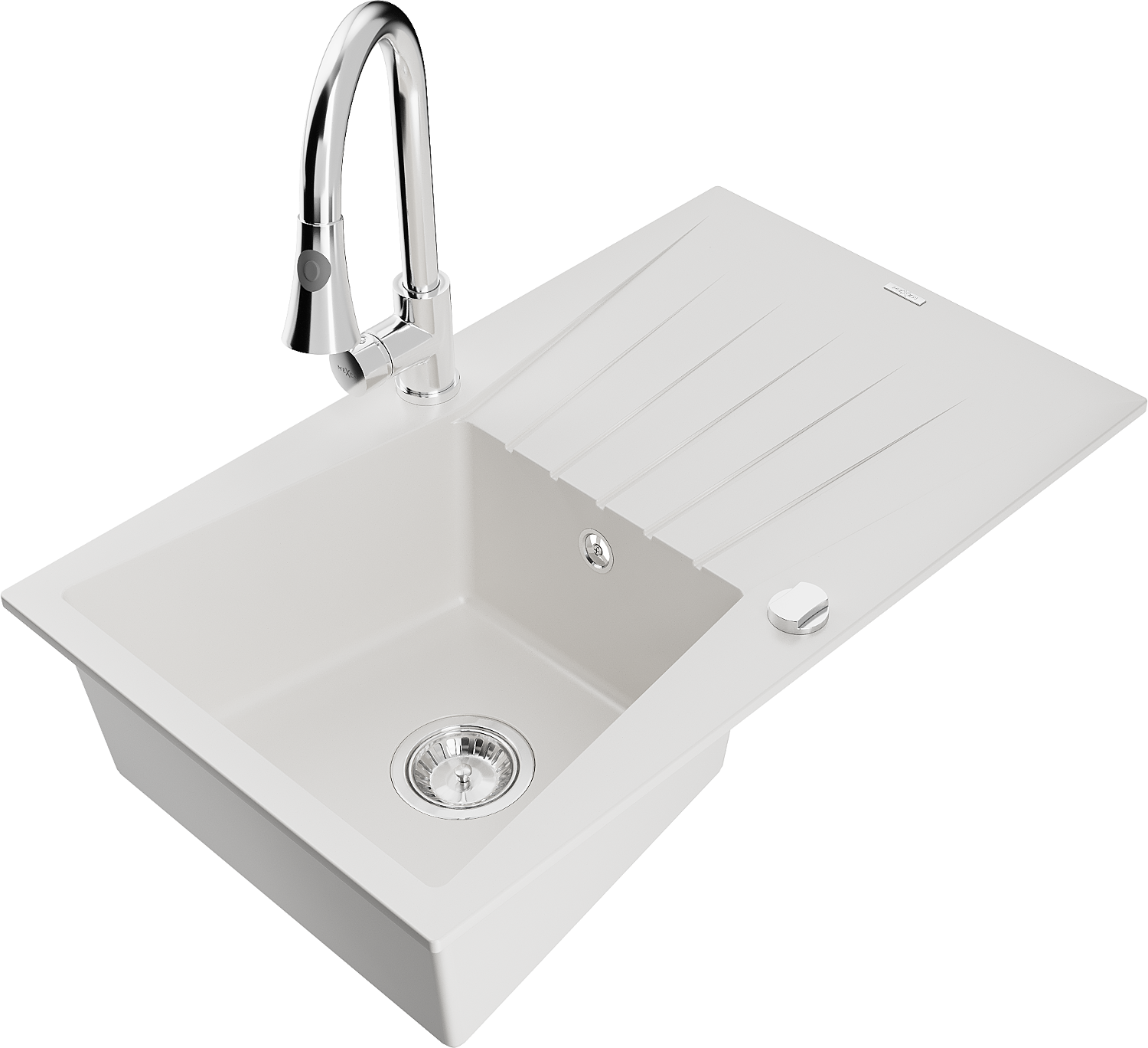 Mexen Cesar évier en granit 1-bassin avec égouttoir et robinet de cuisine Elia, blanc - 6514-20-670101-00