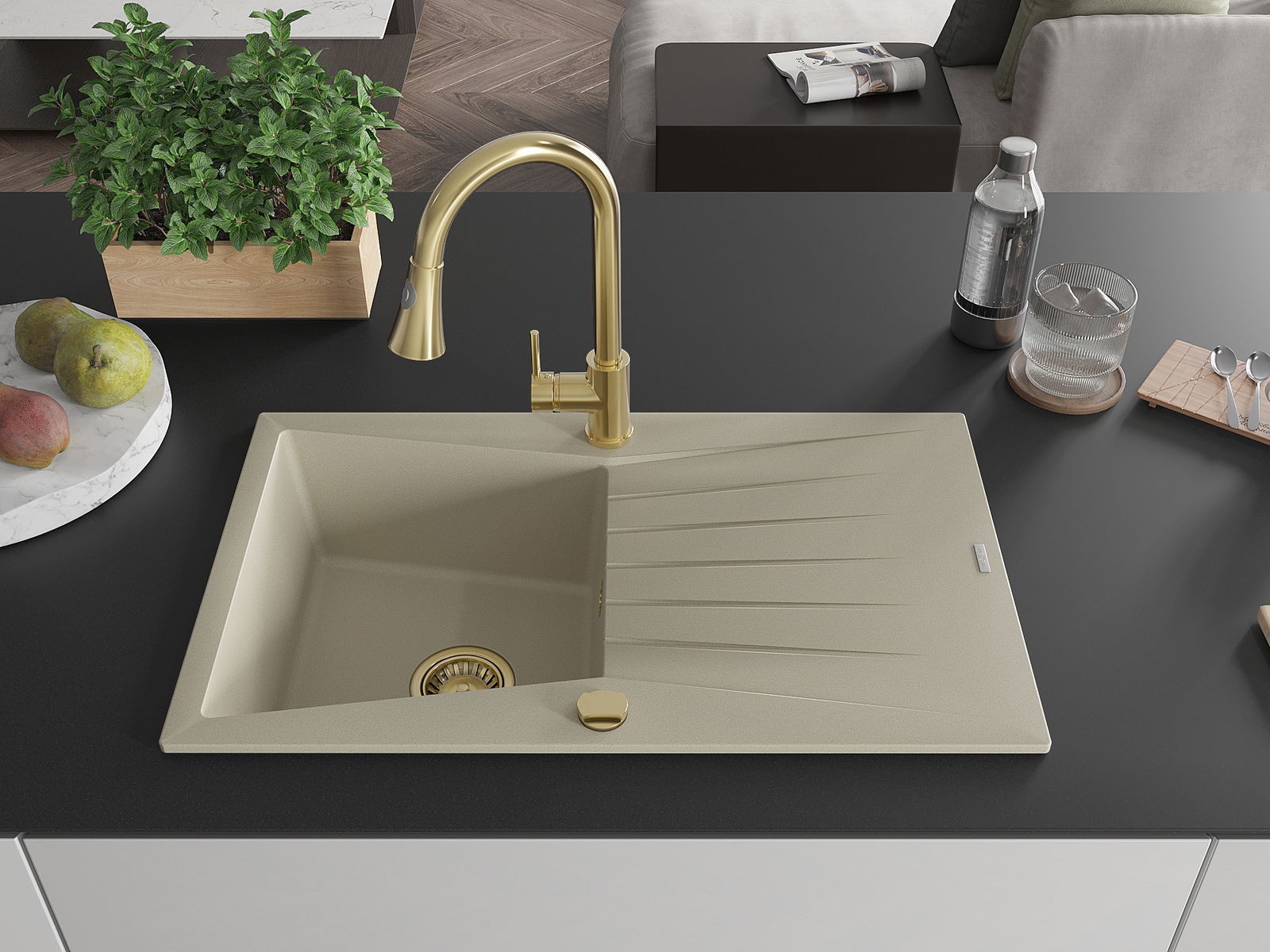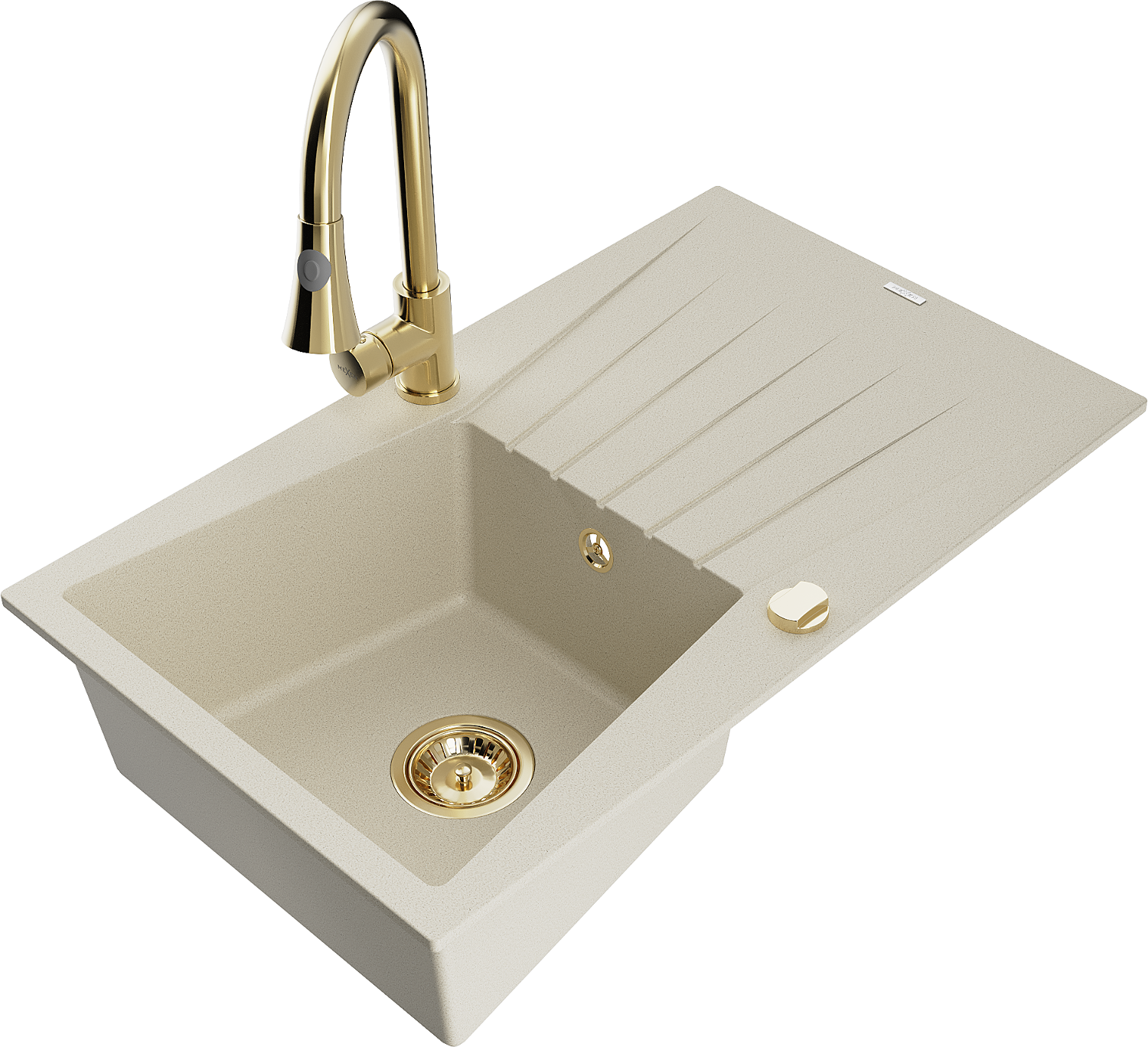 Mexen Cesar évier en granit 1 bac avec égouttoir et mitigeur de cuisine Elia, beige - 6514-69-670101-50