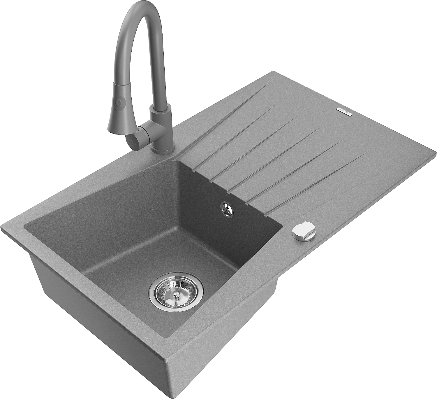 Mexen Cesar évier en granit 1 cuve avec égouttoir et robinet de cuisine Elia, gris - 6514-71-670101-71