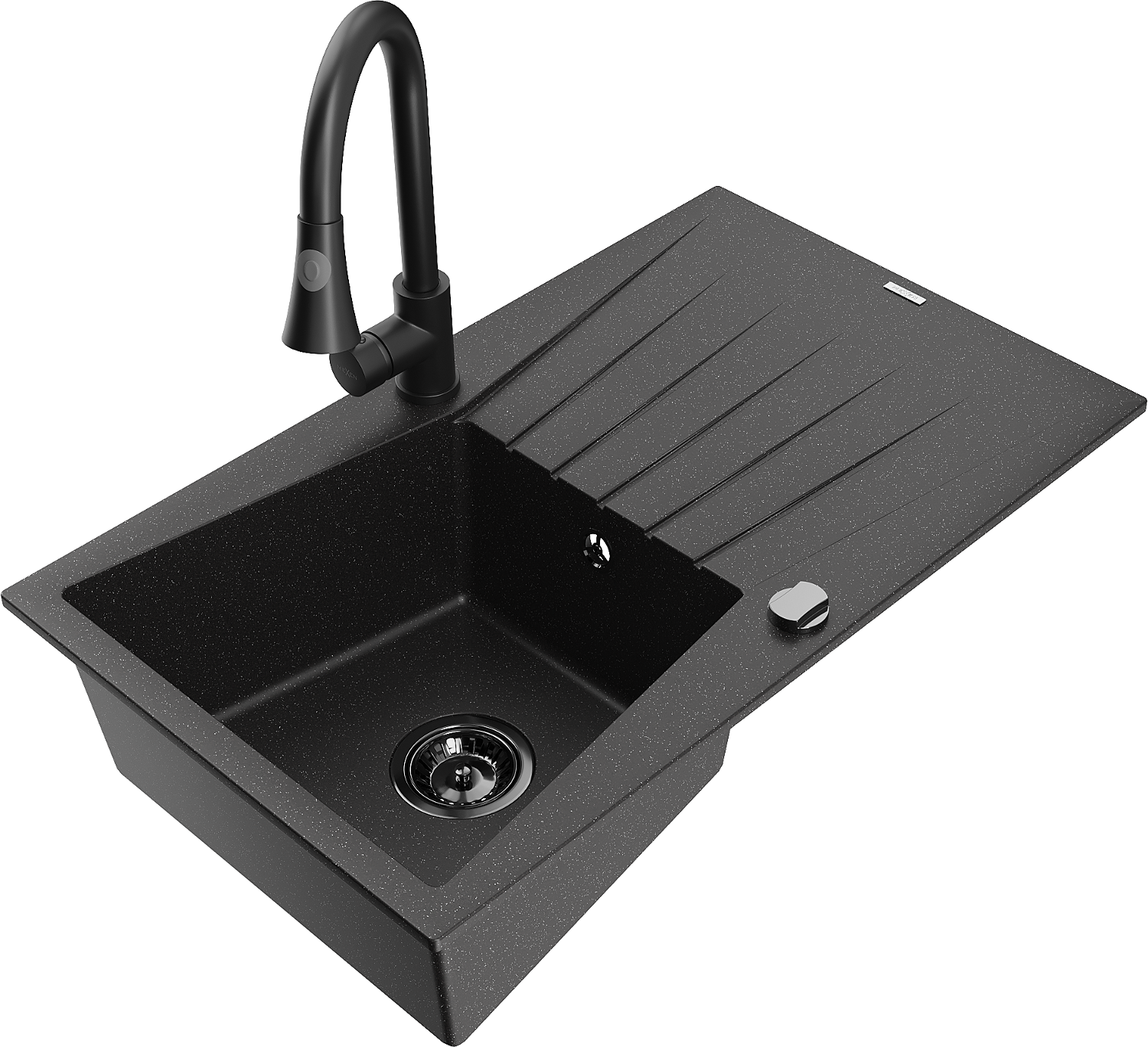 Mexen Cesar évier en granit 1 bac avec égouttoir et robinet de cuisine Elia, noir/argent métallique - 6514-73-670101-70-B