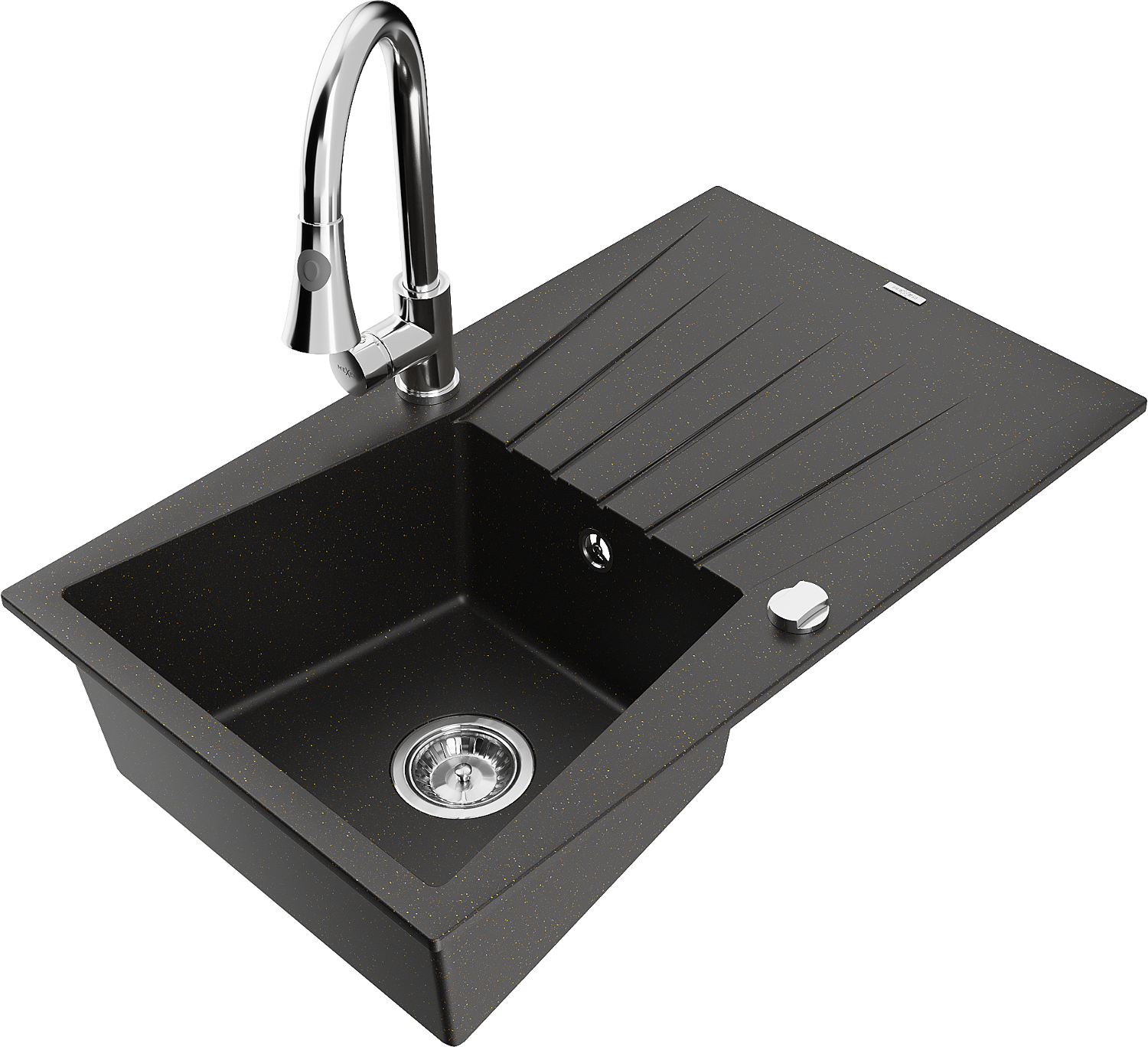 Mexen Cesar évier en granit 1 bac avec égouttoir et robinet de cuisine Elia, noir/doré métallisé - 6514-75-670101-00