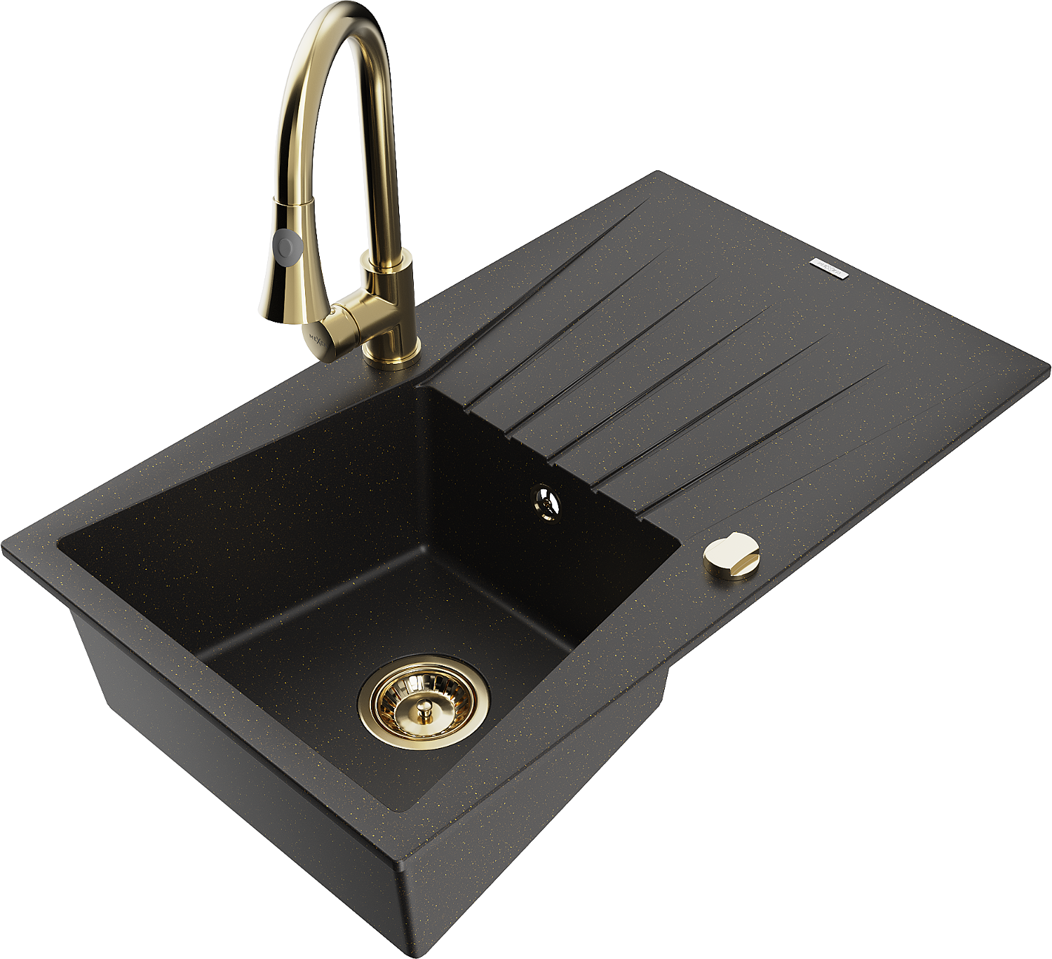 Mexen Cesar évier en granit 1 bac avec égouttoir et robinet de cuisine Elia, noir/or métallique - 6514-75-670101-50