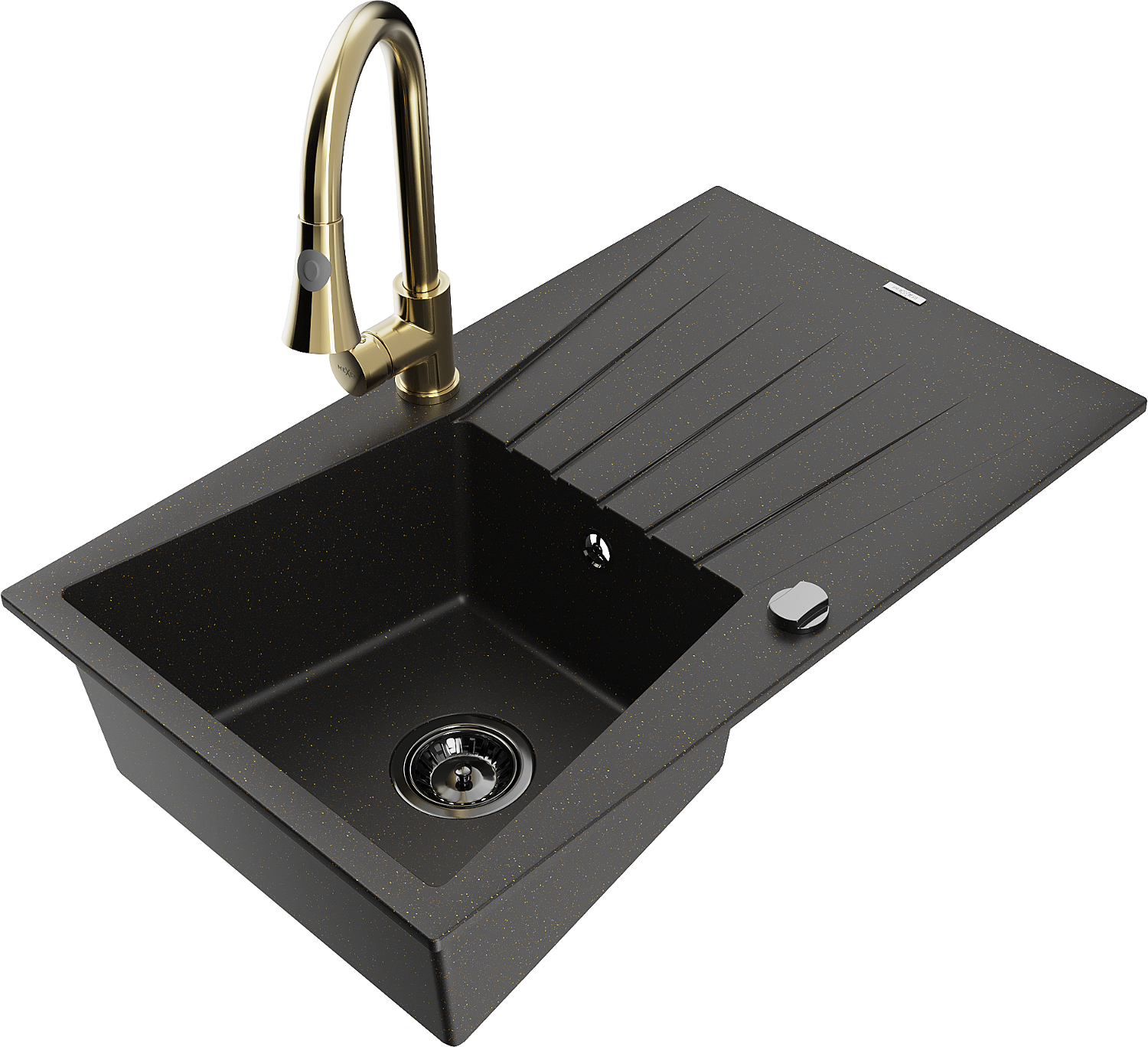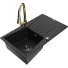 Mexen Cesar évier de cuisine en granit 1 bac avec égouttoir et robinet de cuisine Elia, noir/or métallisé - 6514-75-670101-50-B